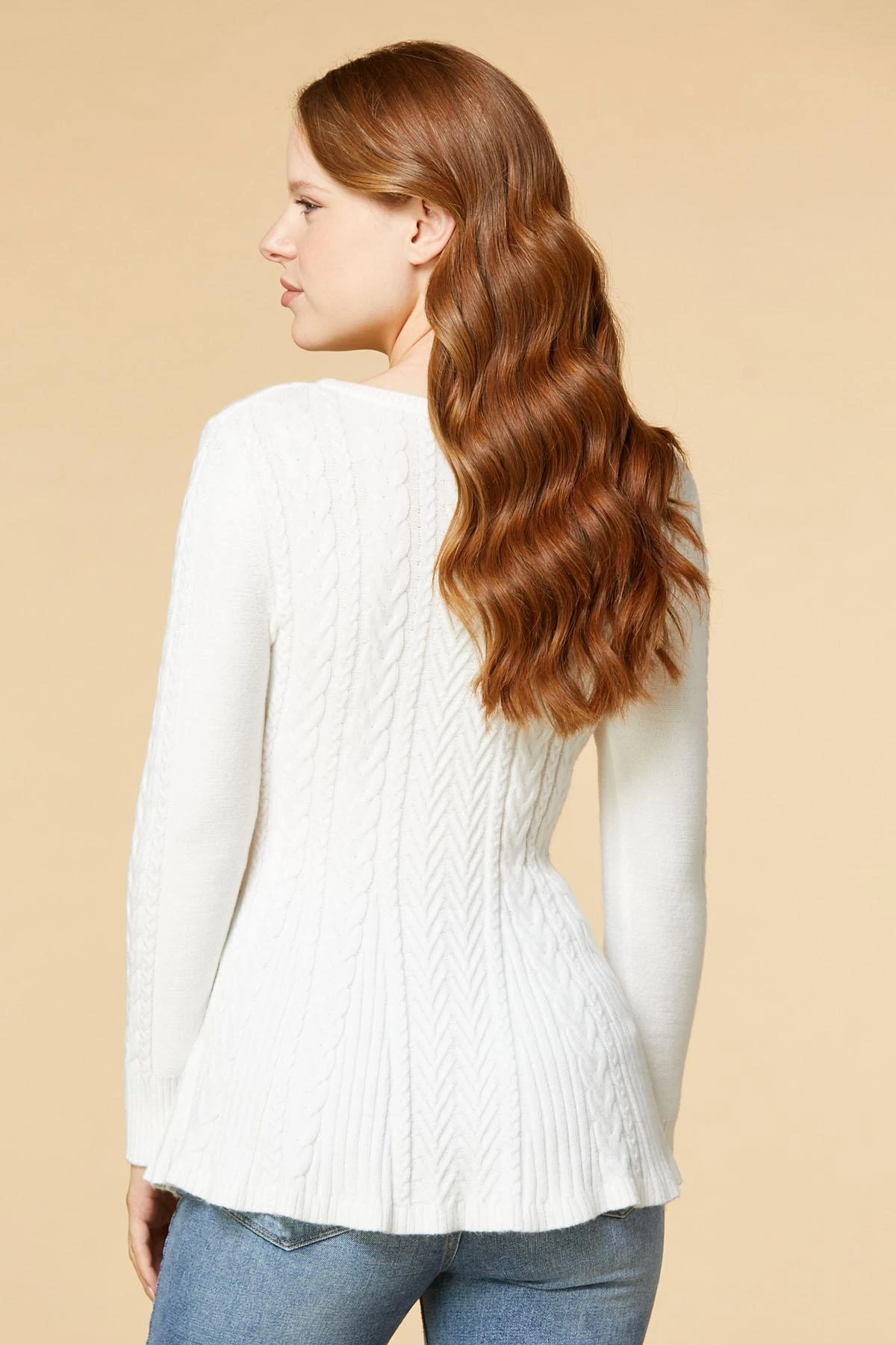 This top fits like a glove. A classic cable knit style with a peplum hem and ultra soft fabrication is the perfect look and feel for a transition into fall.