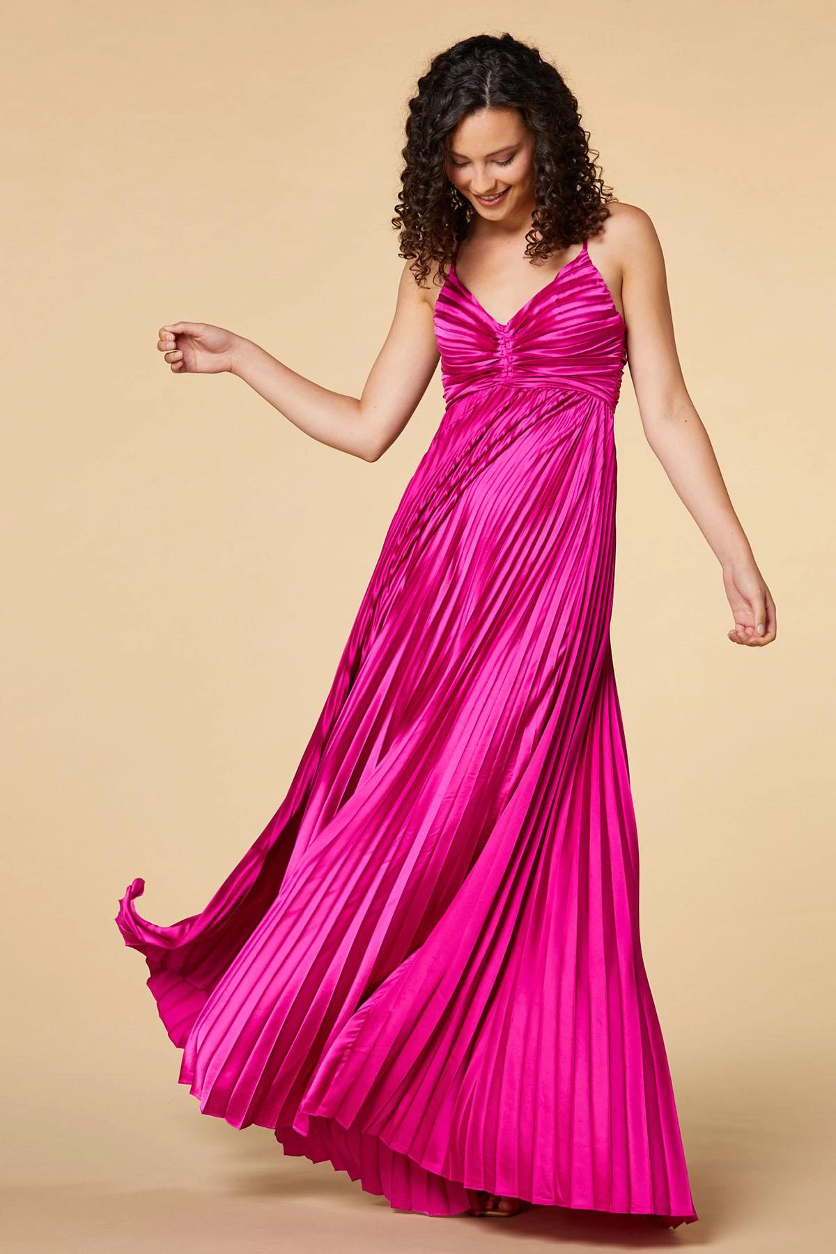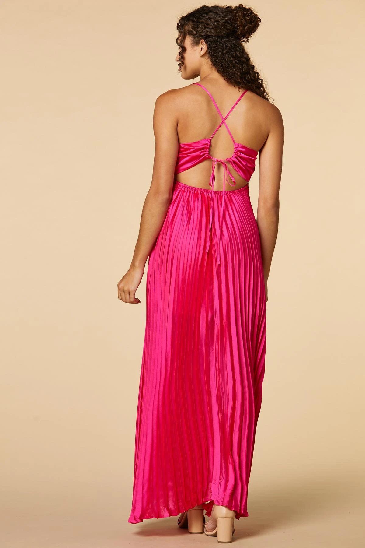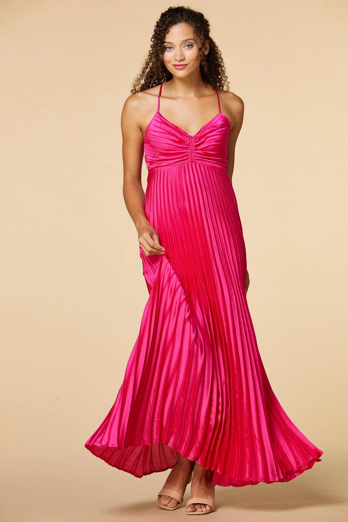 Fall in love with these perfect pleats! This striking maxi dress is perfect for attracting the spotlight with an open back and adjustable spaghetti straps.