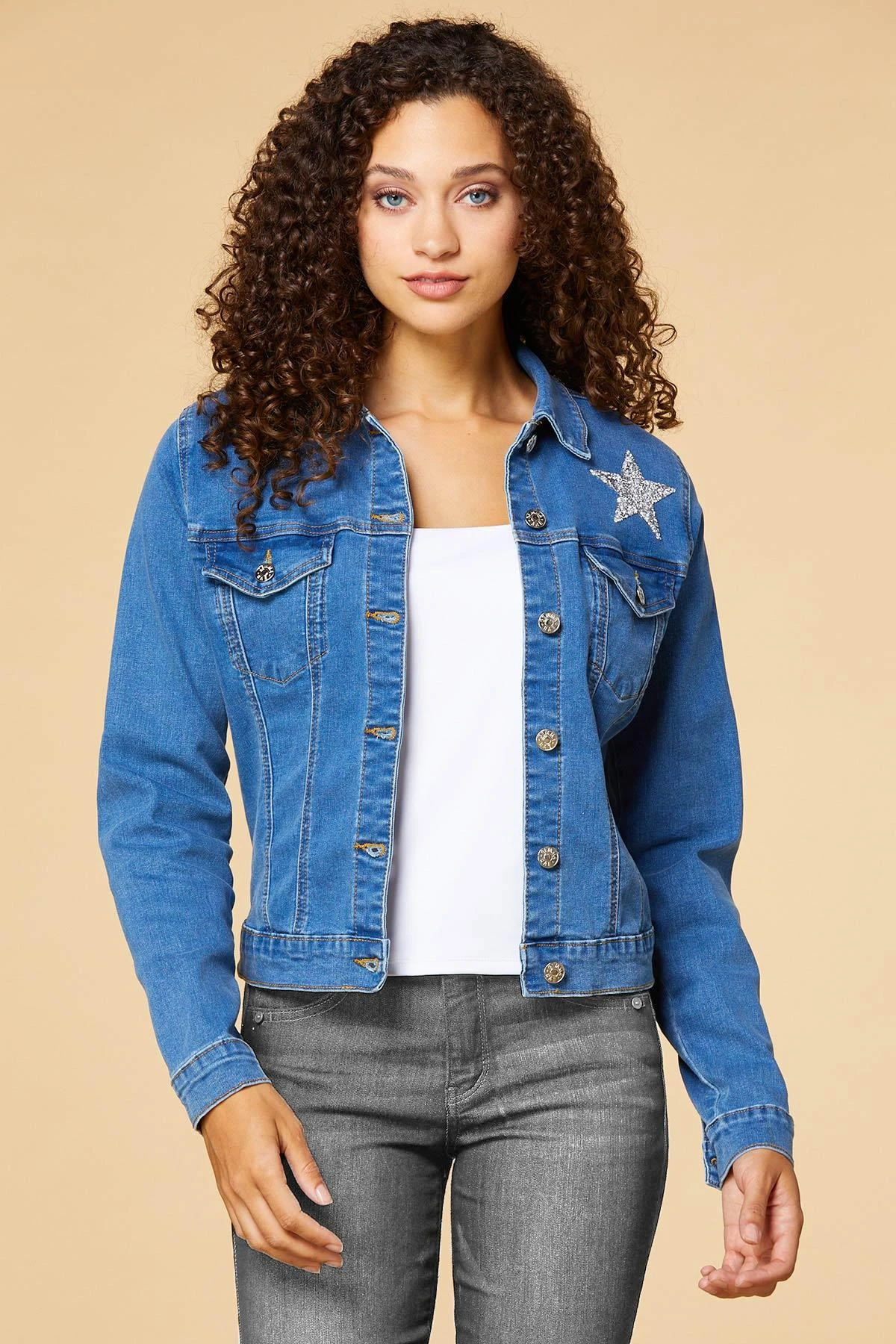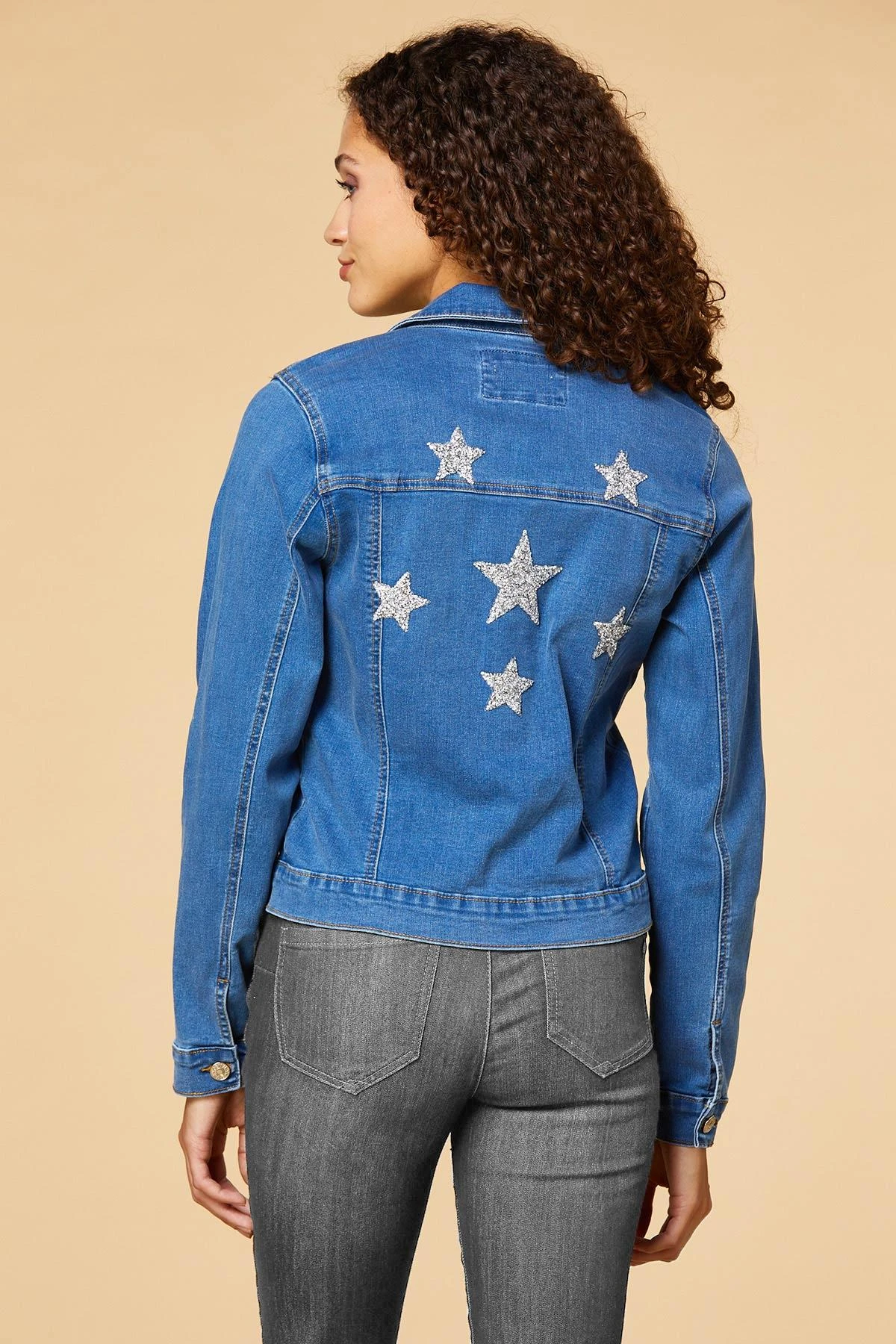 Strut your stuff in this denim jacket with a stretchy feel. You’ll be ready for your close-up with rhinestone studded stars that sparkle and stand out against a medium wash tone.