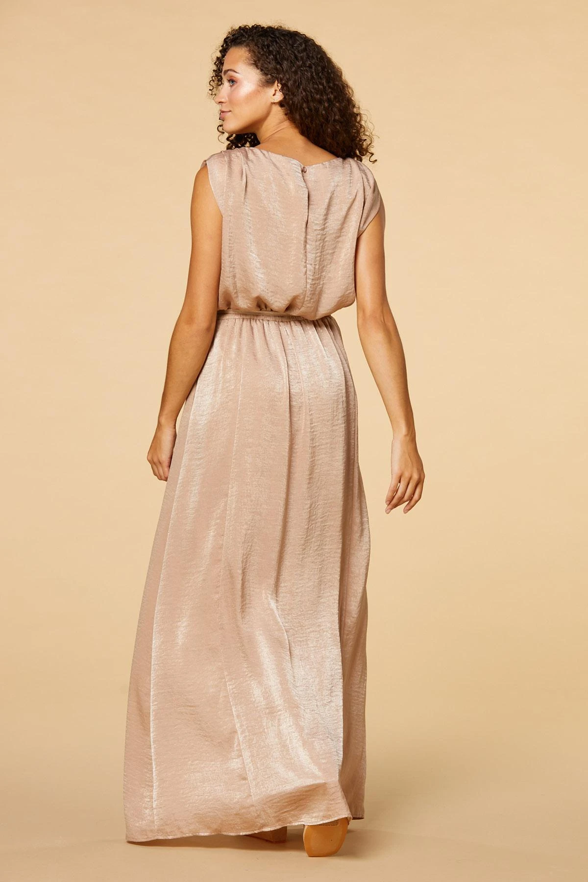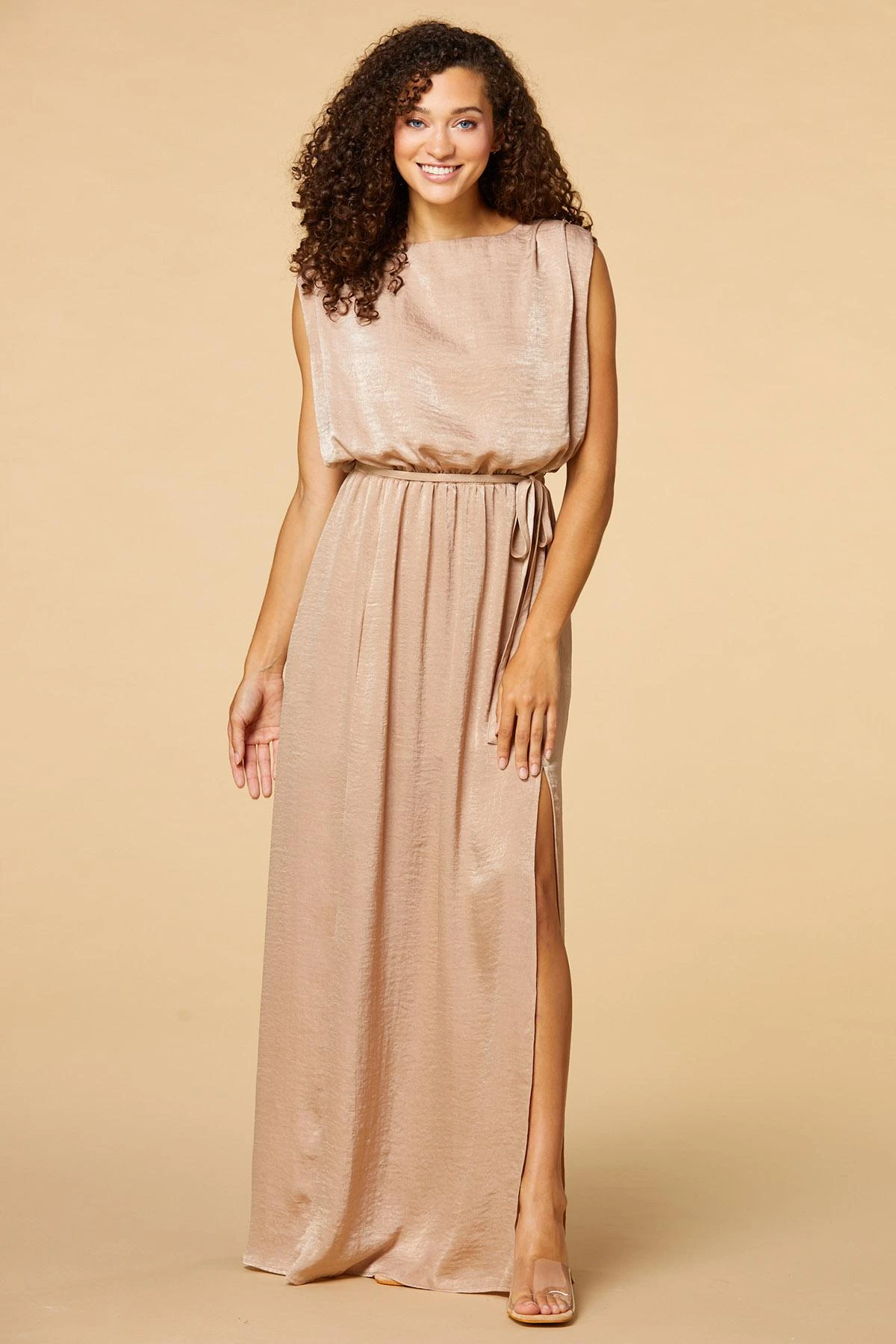 A gown fit for a goddess. This maxi dress is made with shiny satin fabrication in a blouson style with a tie waist and a leg slit. It’s a look so gorgeous it’s sure to spark some inspiration.
