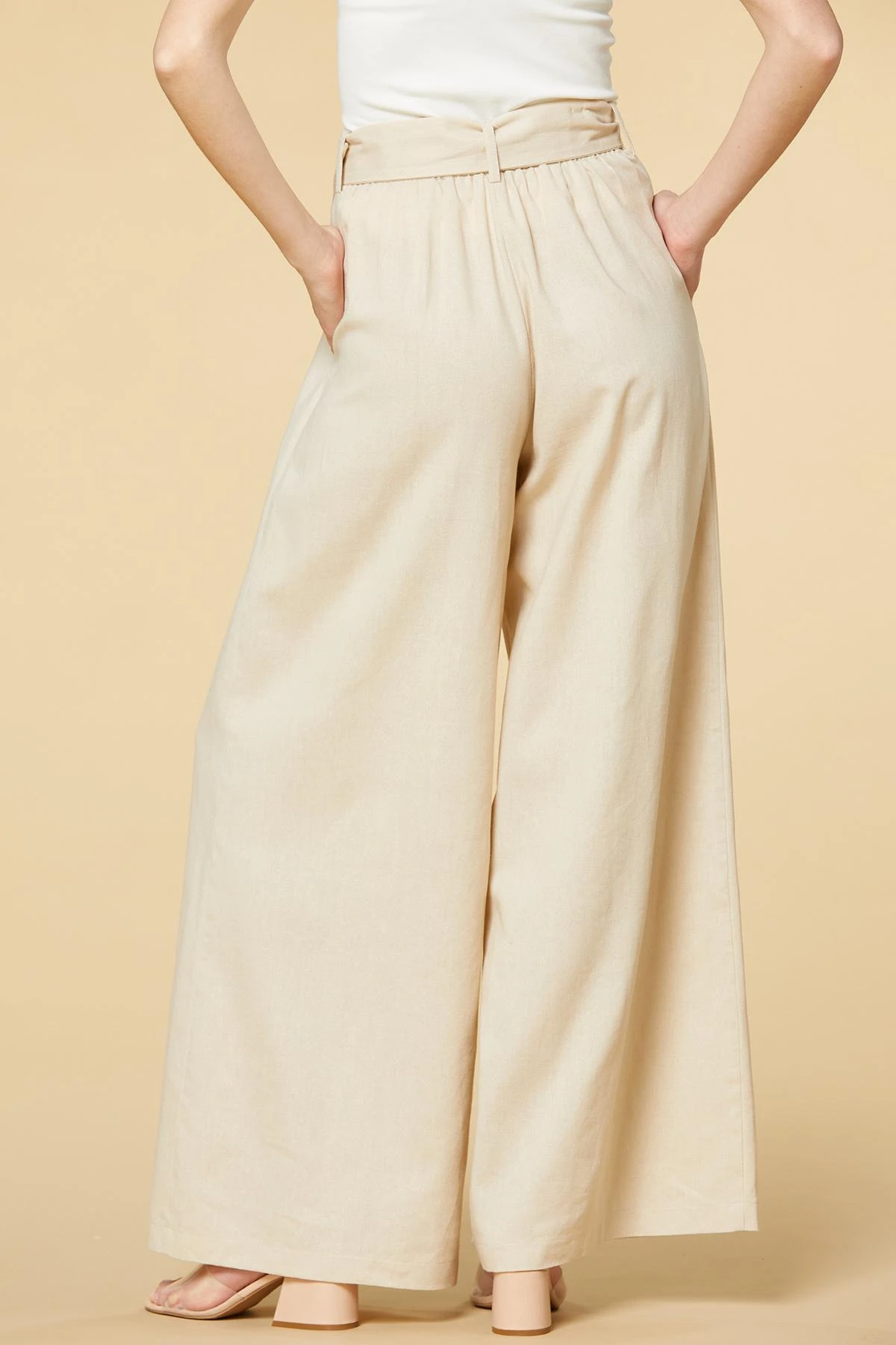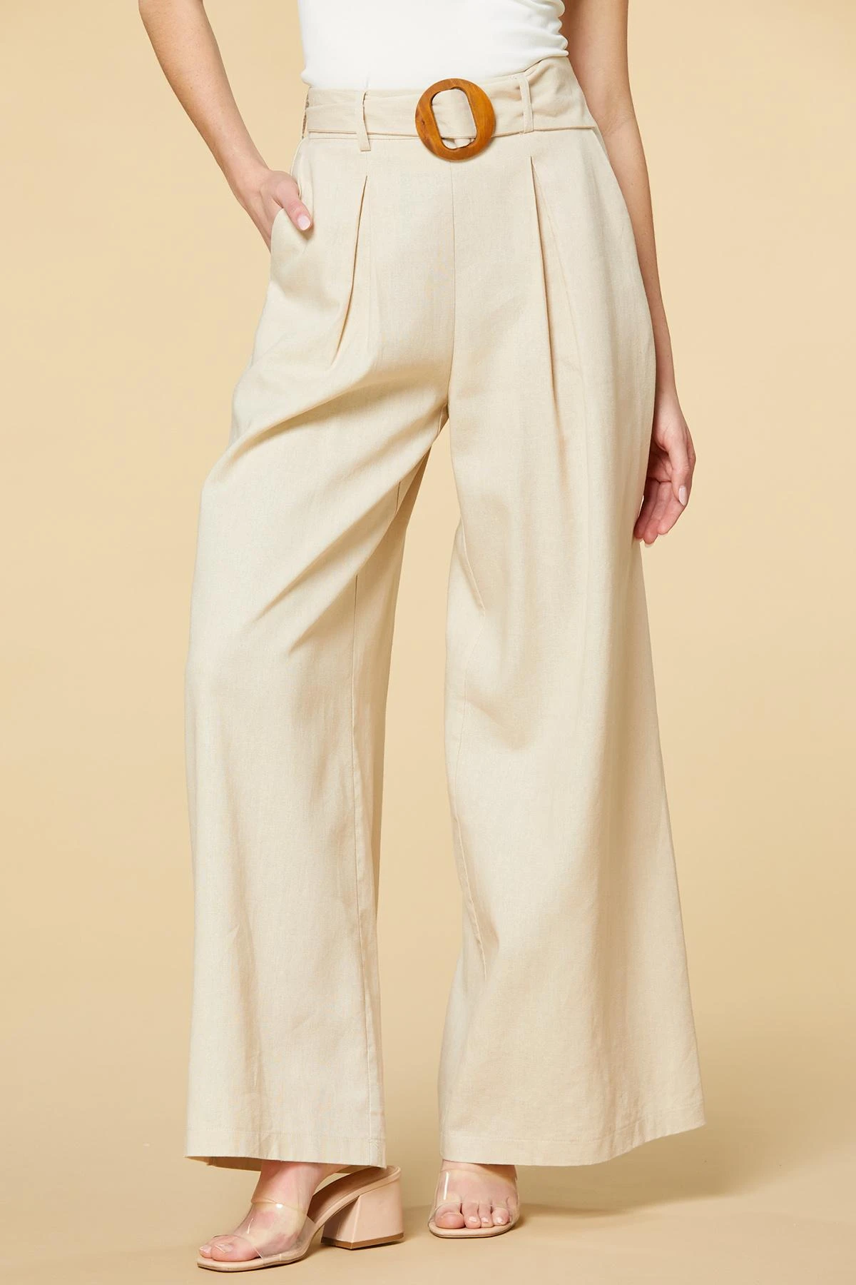 These wide leg pants are perfect for work or play. Pleated with a chunky wood belt for style.