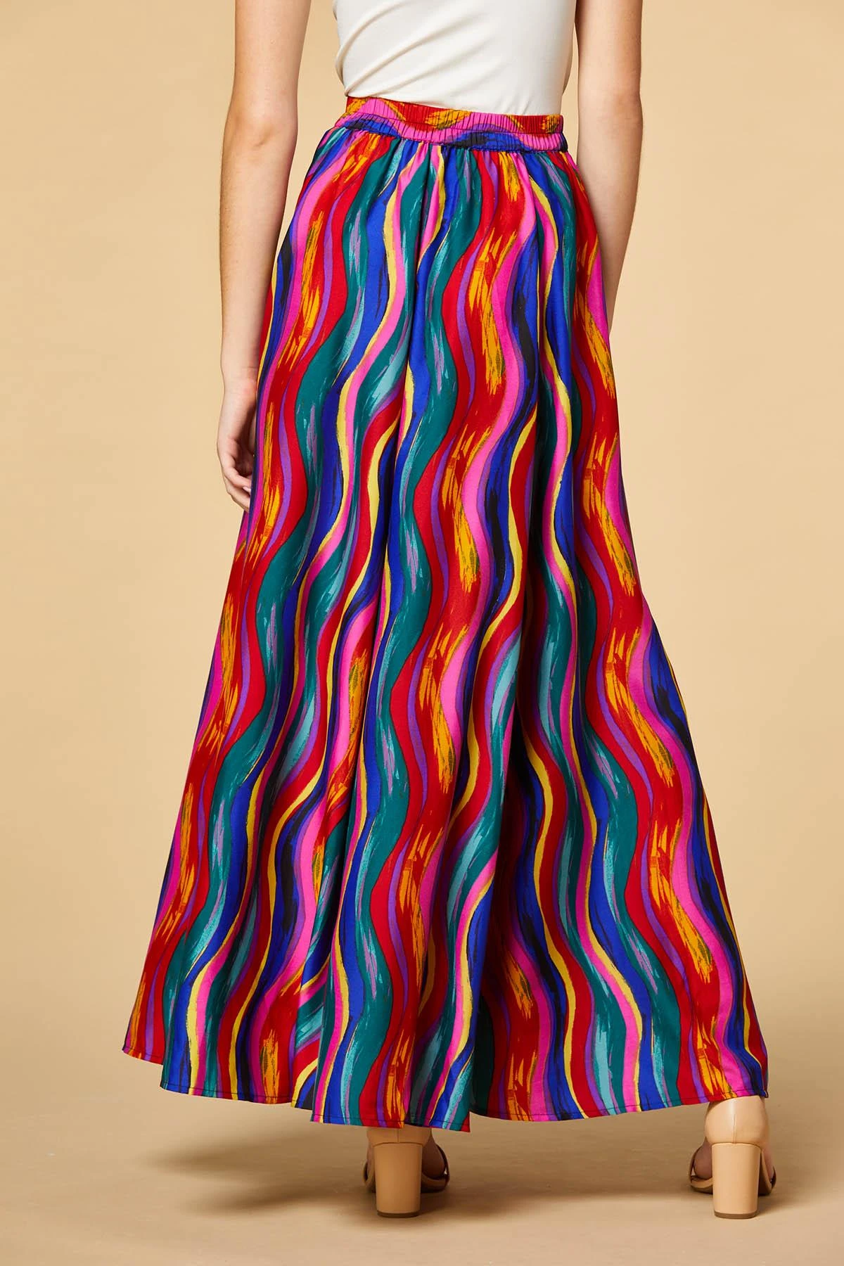 A true work of art. This maxi skirt is a stunning number with a wavy multicolor print and tie belt.