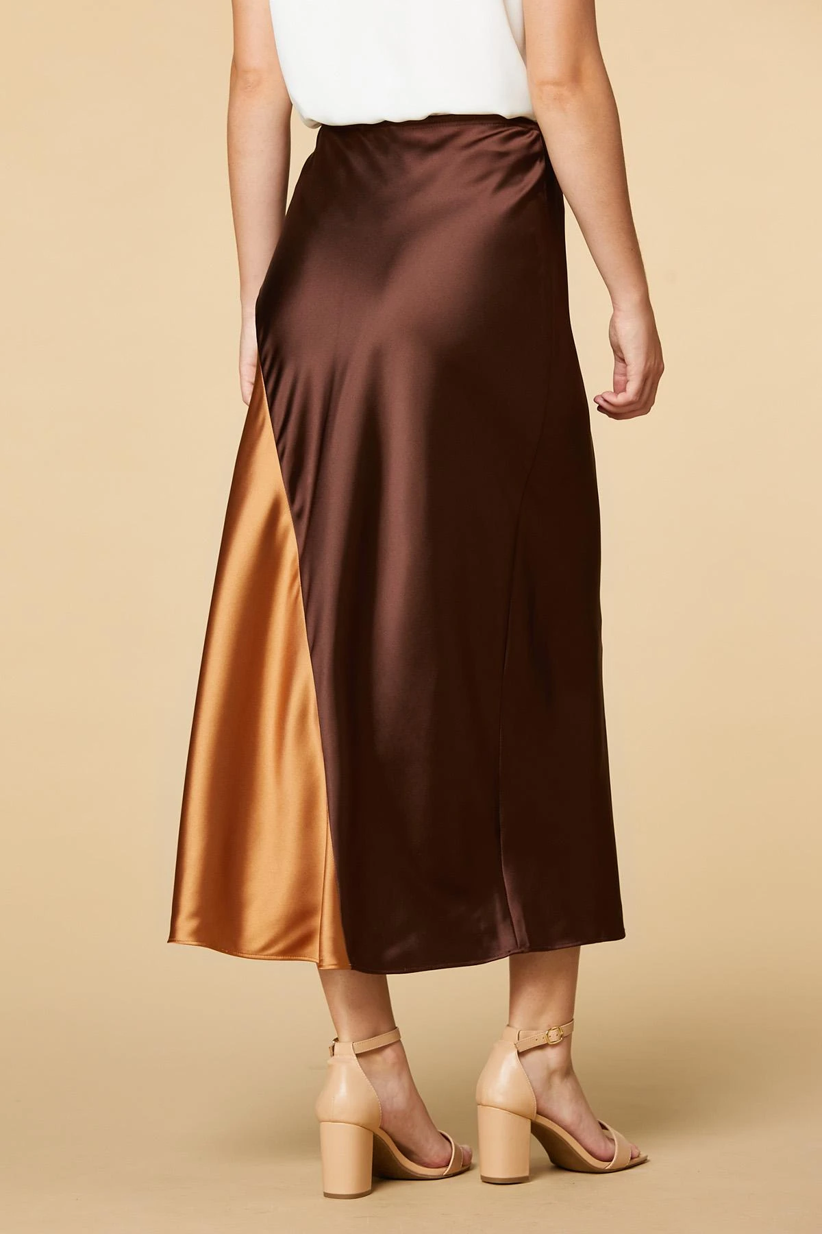 You know exactly what you’re getting with this skirt. Silky-smooth satin fabrication with a colorblock print and a midi length is always a sweet treat.