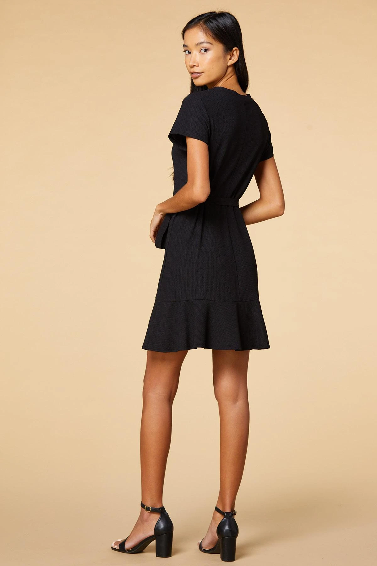 It’s reservations for one or perhaps, two with this textured dress. A scoop neckline meets short sleeves, a belted-tie waist and flirty, flounced hem for a timeless, noteworthy-navy look.