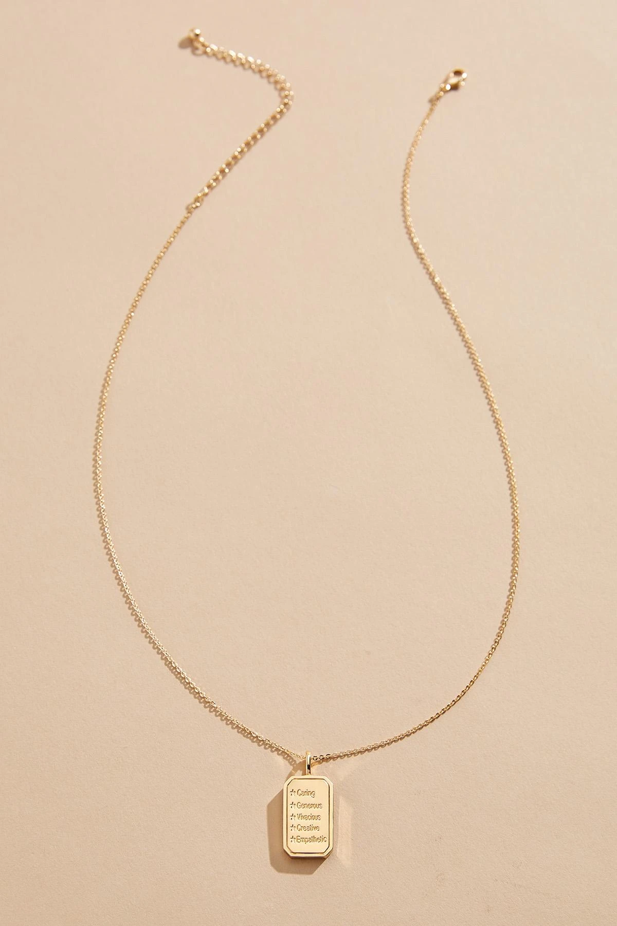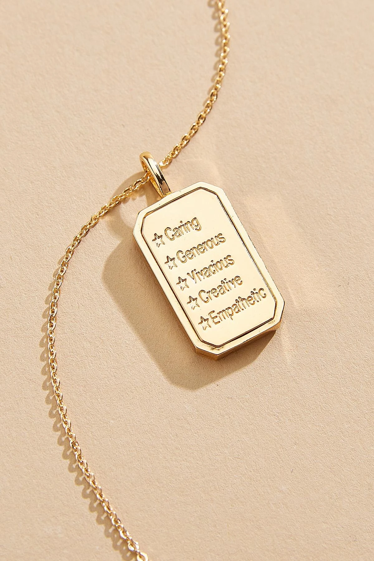Pendant backside reads “caring, generous, vivacious, creative, empathetic”