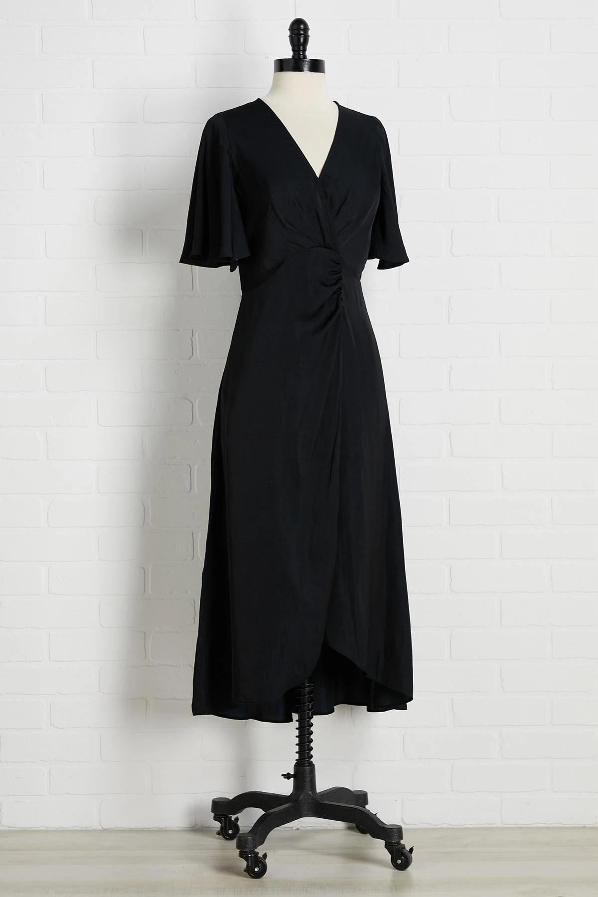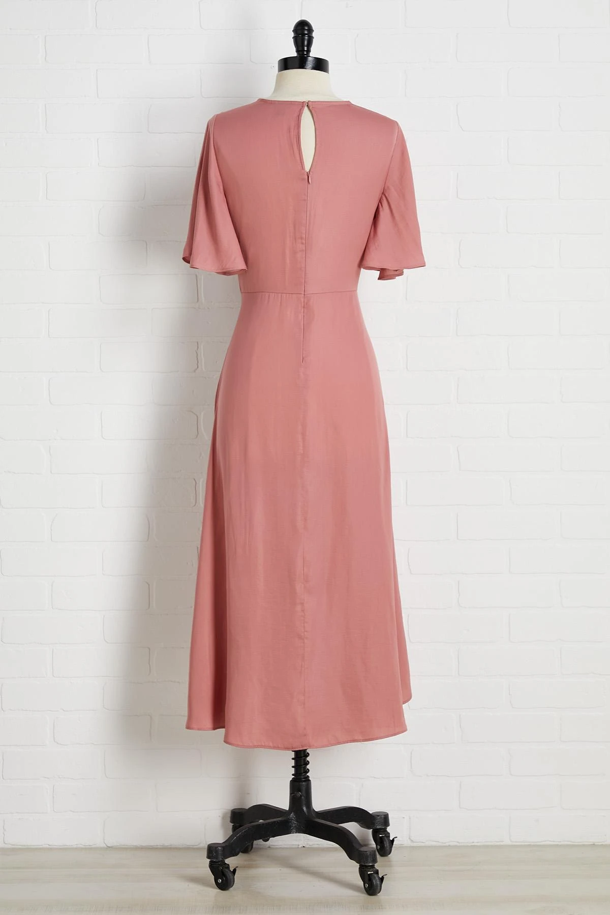 You’ll be falling softly over this satiny midi with a surplice, v-neckline, slightly gathered bodice, flutter sleeves and flirty, slit front.