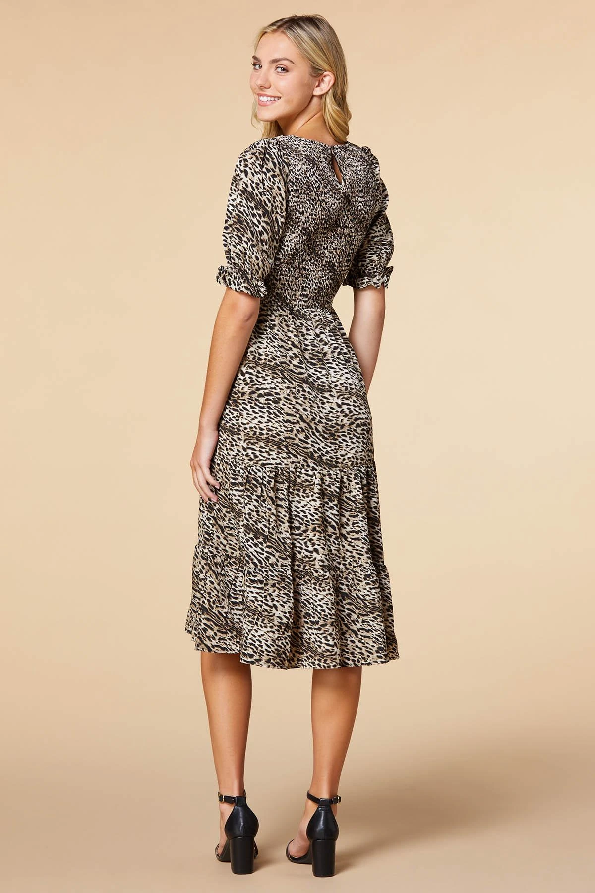 Cat got your tongue? We don’t blame you. This midi dress is stunning with a smocked top, puffy sleeves and a slit hem.