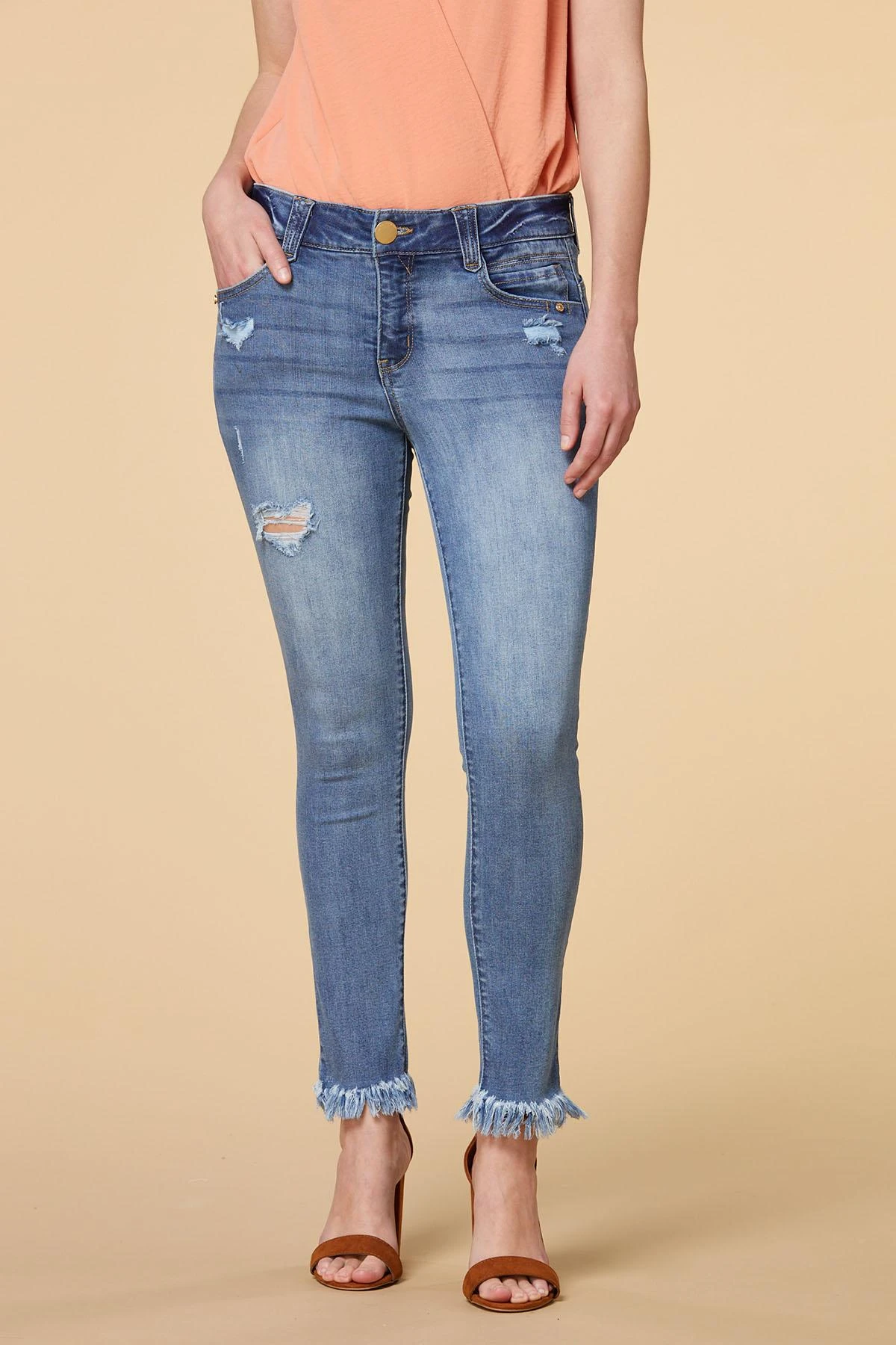 A little confidence boost, perhaps? This denim style features a comfortable stretch and shape enhancing features for a look-good, feel-good fit, while distressed detail and a frayed hem go beyond basic in a fun and fresh way.