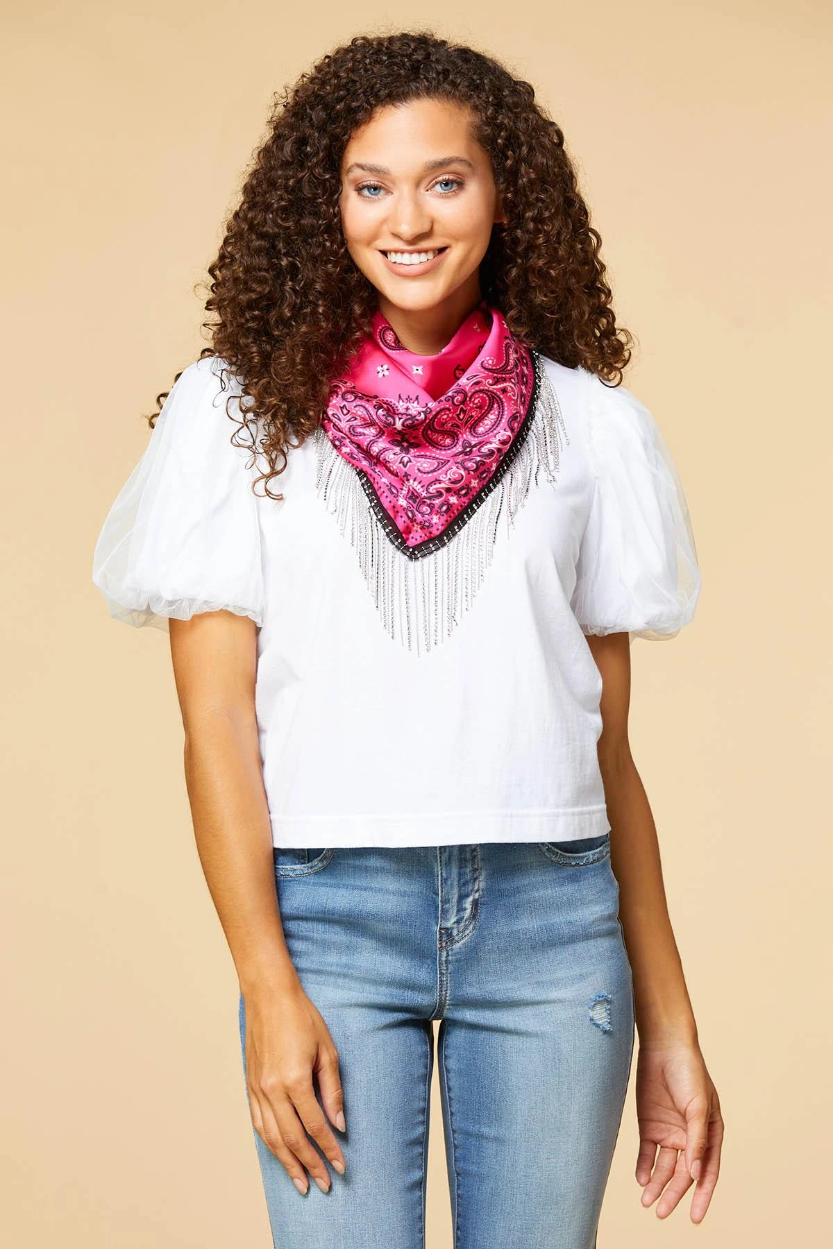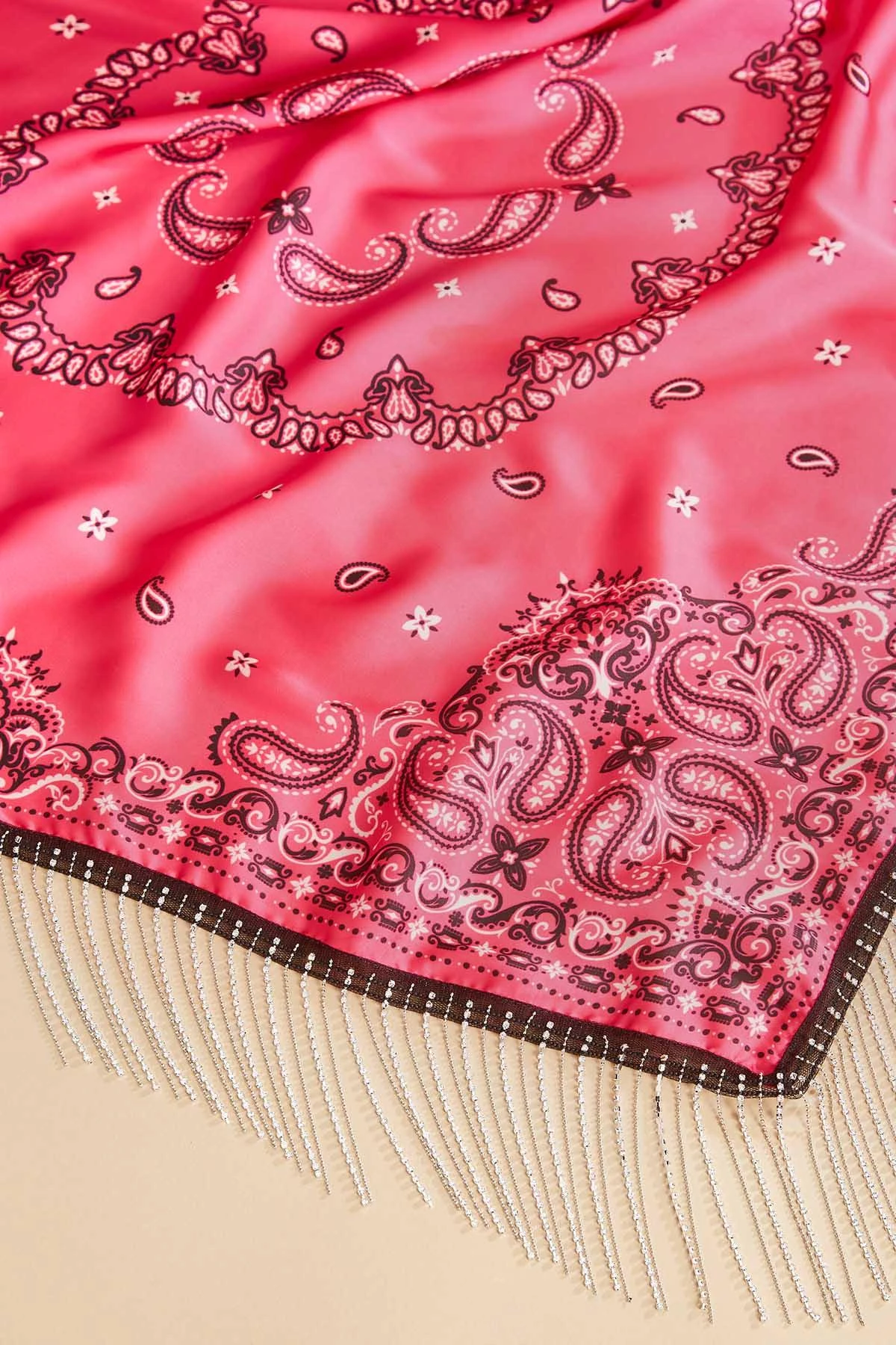 Get your groove on country-style with this hot bandana! Smooth fabrication with a hot pink paisley print is blinged up with rhinestone fringe.