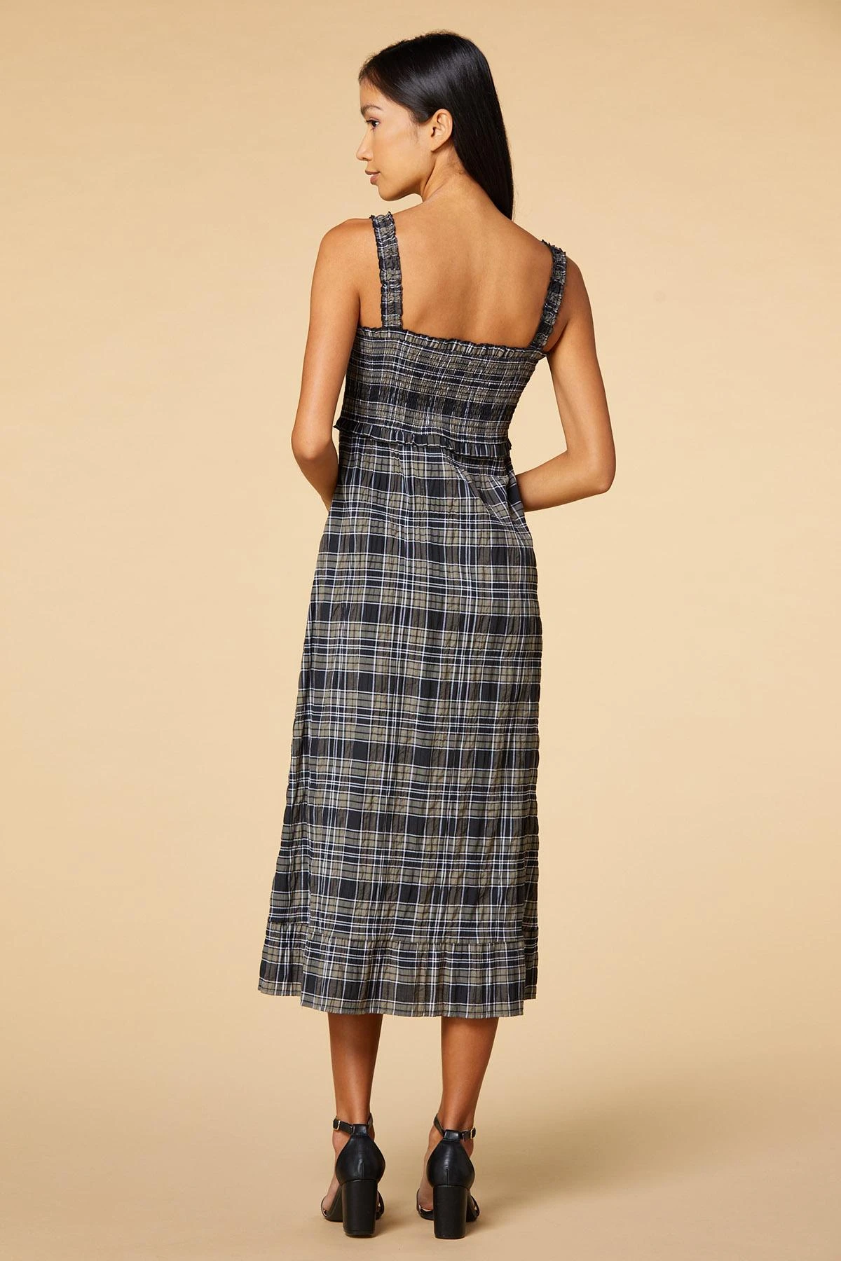 It’s impossible to be in a bad mood when you’re in this plaid number. A midi dress with textured seersucker fabrication, a plaid print and a sweetheart neckline creates a classically pretty outfit.