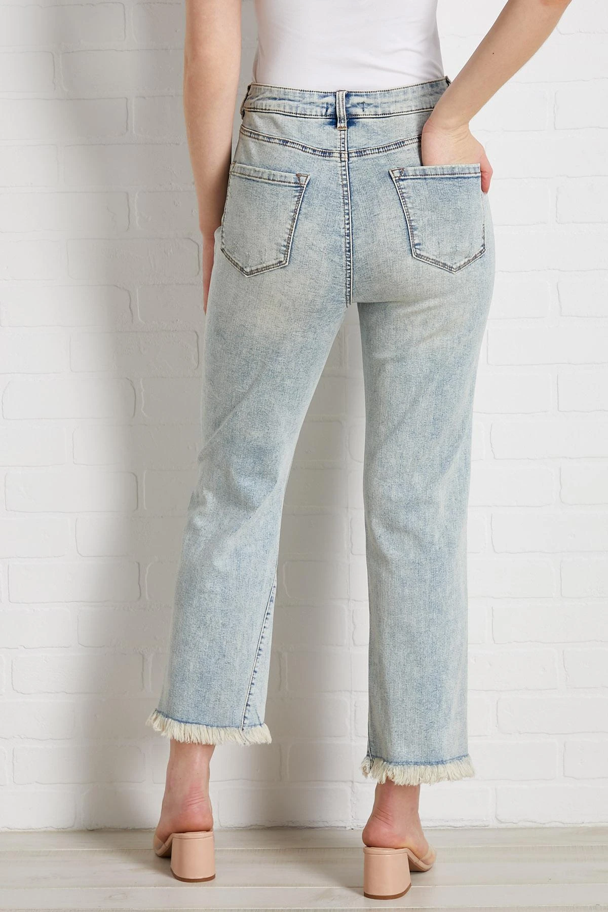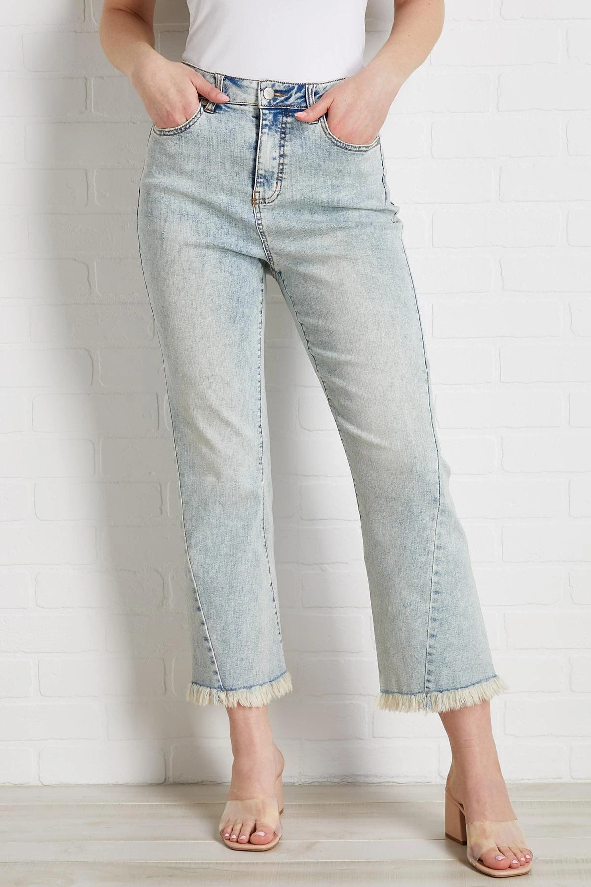 It’s fabulous, denim days ahead with this cropped style. A faded-blue hue tops off an asymmetrical seam, flattering-stretch fit and frayed hem.