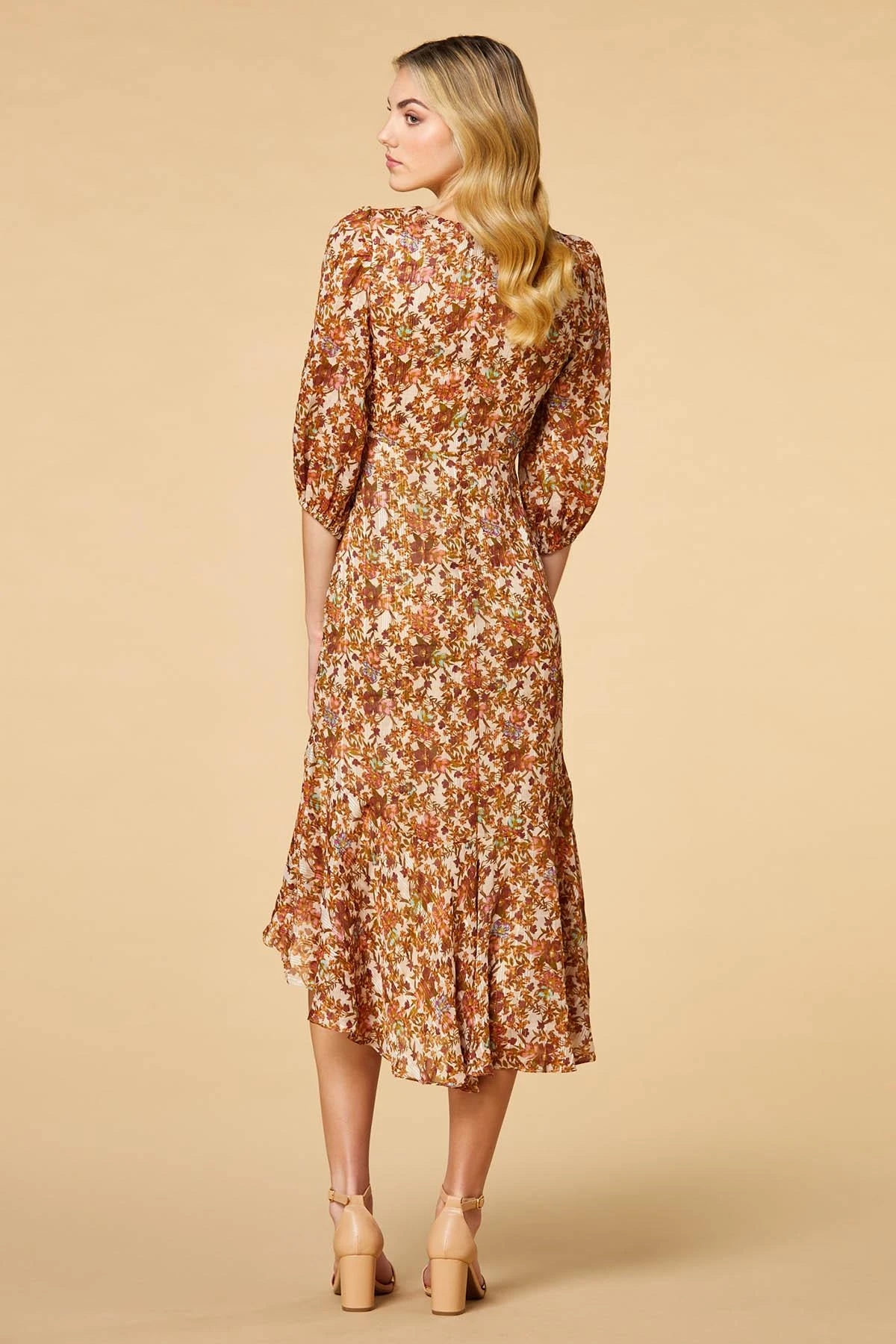 Looking for a lovely new bouquet? You got it. This midi dress includes a multicolor floral print with metallic details, a tie front and an asymmetrical hem for a look that’s just rosy.