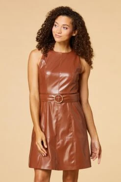 This dress looks so good they’ll have no choice but to stop and stare. Faux leather fabrication with a ring belt and a fit and flare style flatters your shape and keeps you on trend no matter where you go.