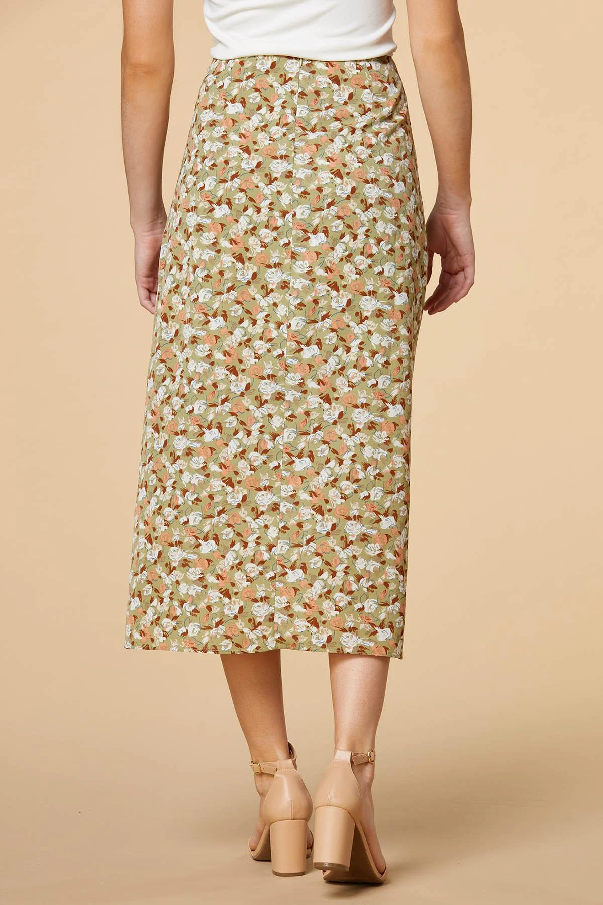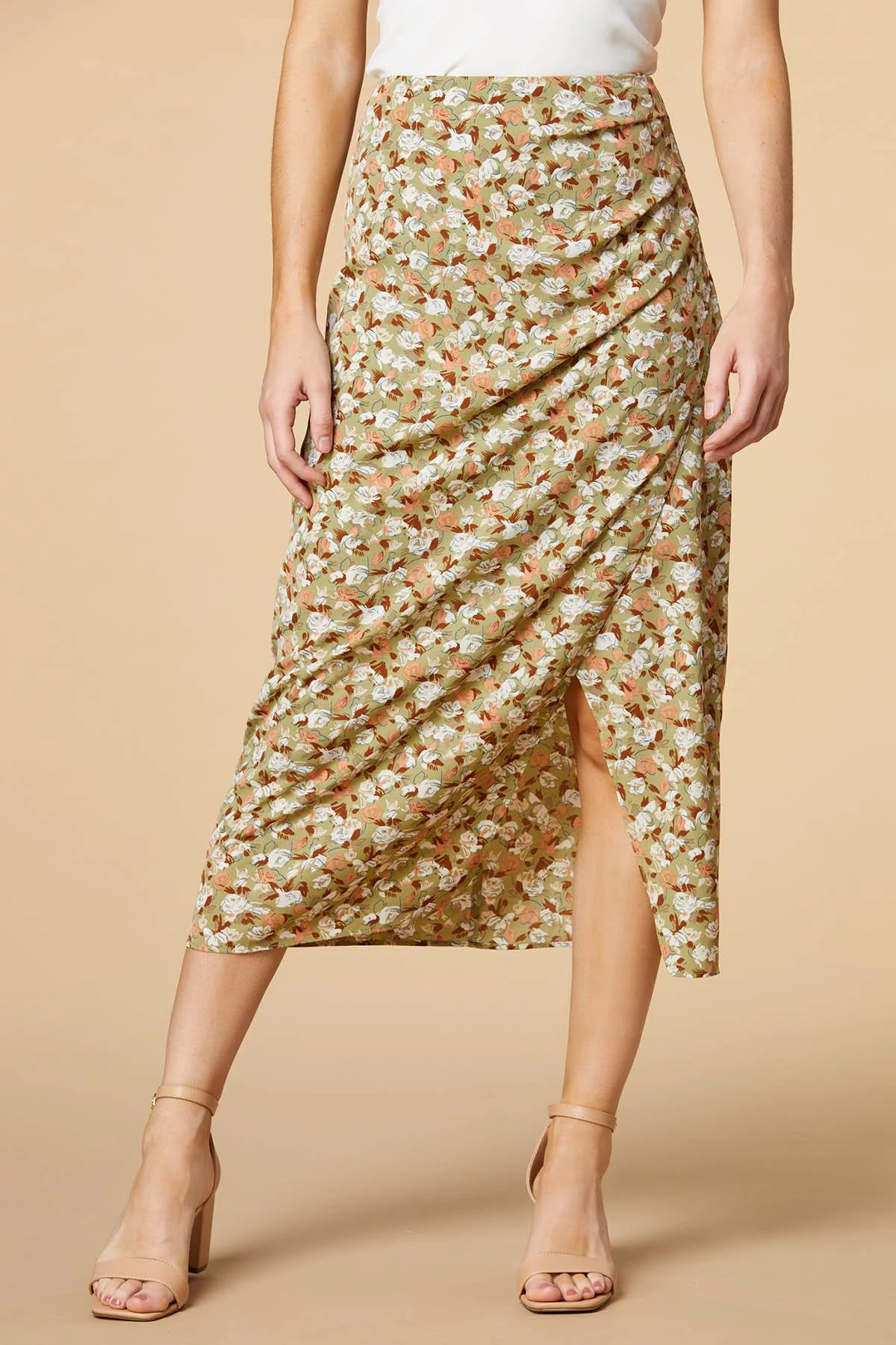 Travel to a flowery field with this midi skirt. Light fabric and a leg slit create a loose and breezy fit while the floral print and ruched side make this skirt a style you won’t want to miss.
