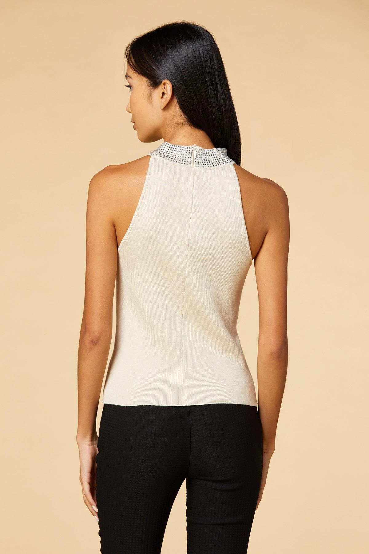 Ready to sparkle and shine? Go with this sweater tank. A rhinestone-studded halter neckline with rhinestone fringe is sure to help you stand out among any crowd.