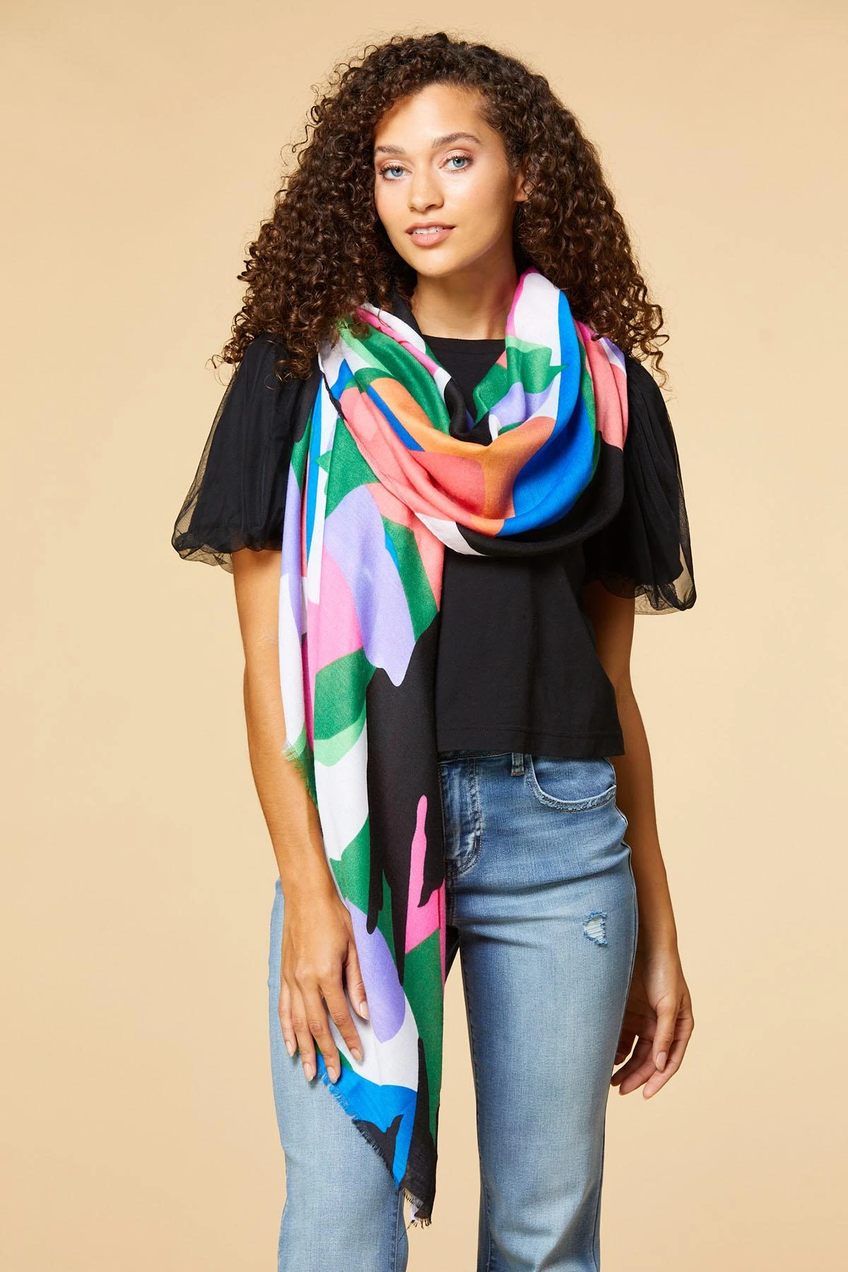 This scarf always passes the fit check. A colorful abstract-floral print with a distressed edge is a perfect fit for both your outfit and your comfort.