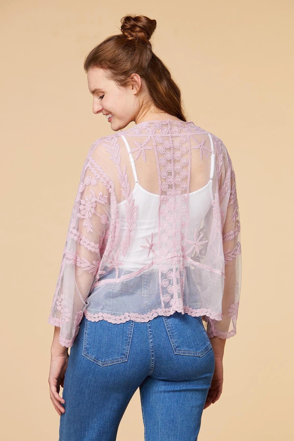 This lovely kimono with embroidered lace details is the perfect accessory for any spring outfit. You’ll feel the warm breeze whether you keep it open or tie it in the back.