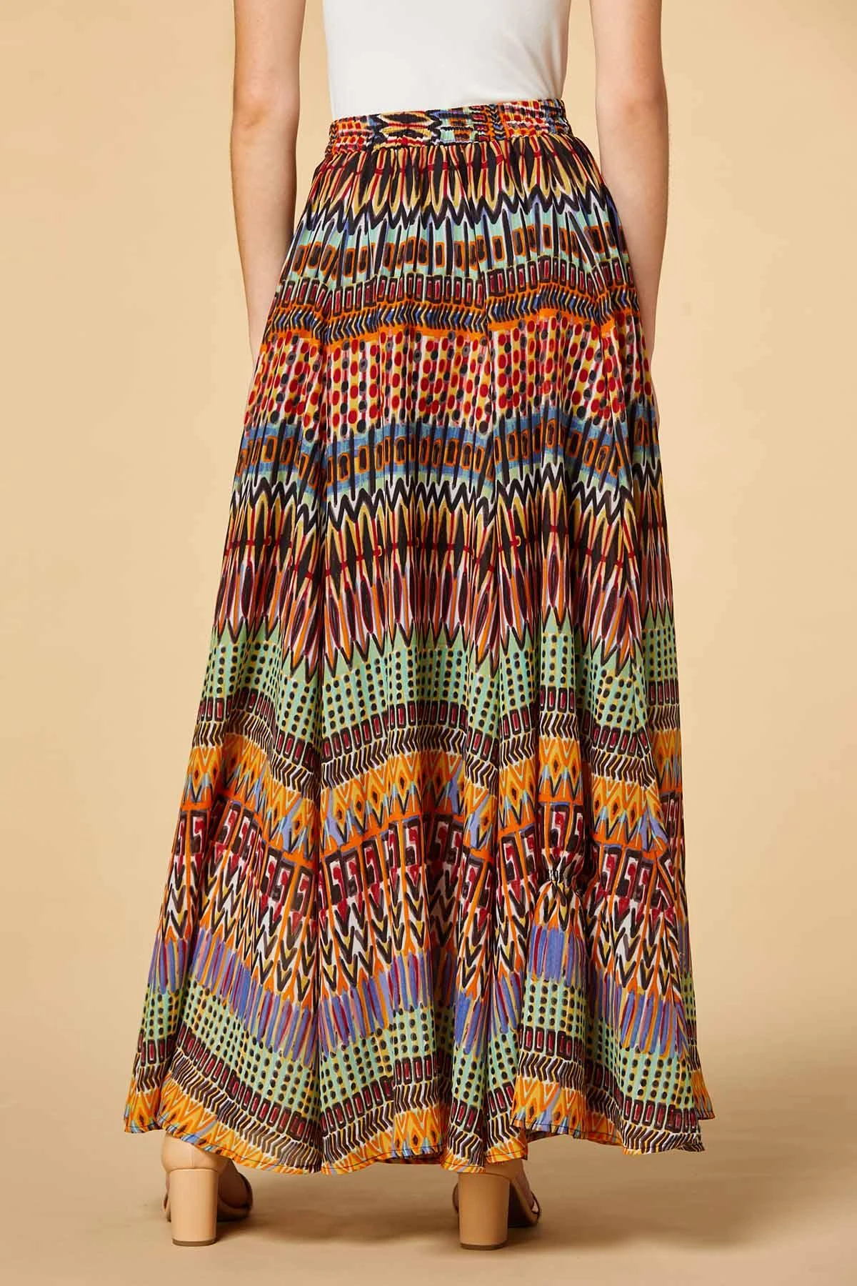Mixed prints for miles. This maxi skirt features multicolor geo prints and a tie belt to keep you secure while you flutter through the breeze.