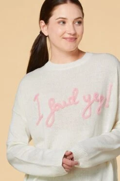 Shout it from the rooftops! With this graphic sweater, you can share your good news everywhere you go without even speaking. Tinsel lettering on soft fabrication makes this a cozy sweater you can wear even after the bachelorette.
