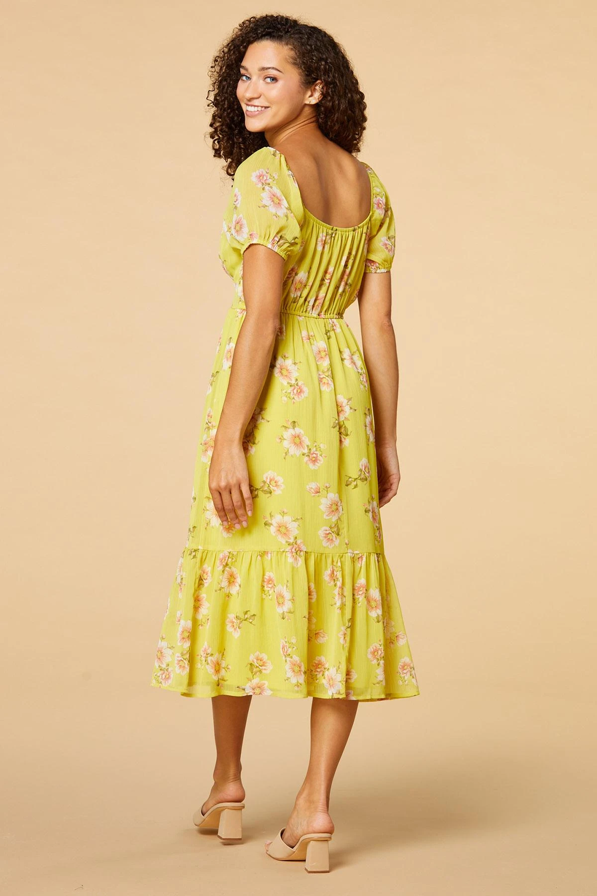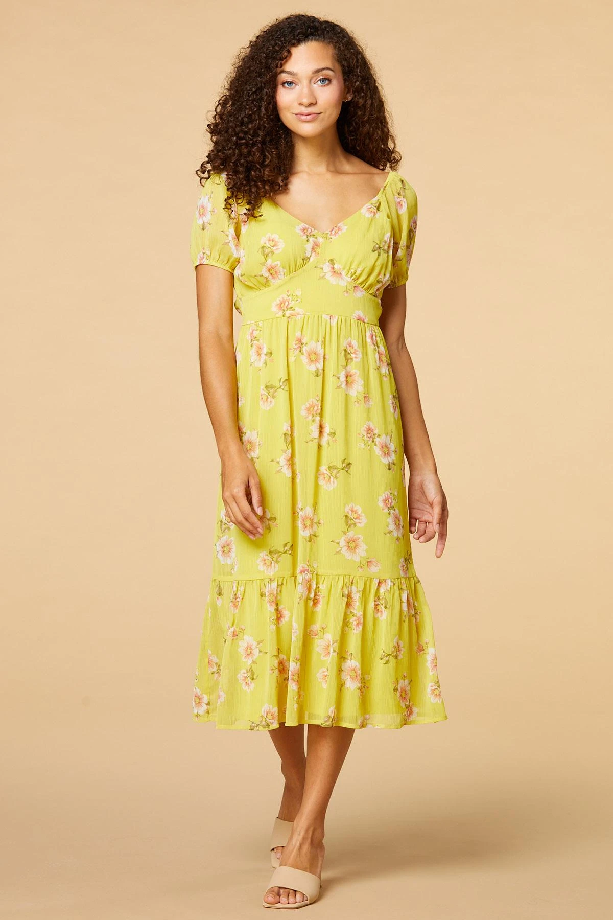 It’s all eyes on you in this bright and bold midi dress. A springtime floral print, tiered body and cap sleeves create a look that’s made for a breezy, beautiful day.