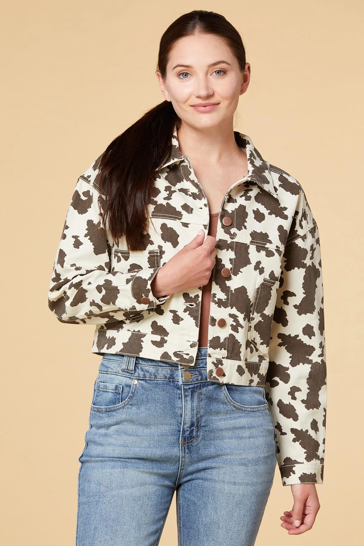 All out of cute jackets? Don’t have a cow, we’ve got just the thing for you. This denim jacket includes a cow print and a cropped style for a trendy final piece of your new favorite outfit.
