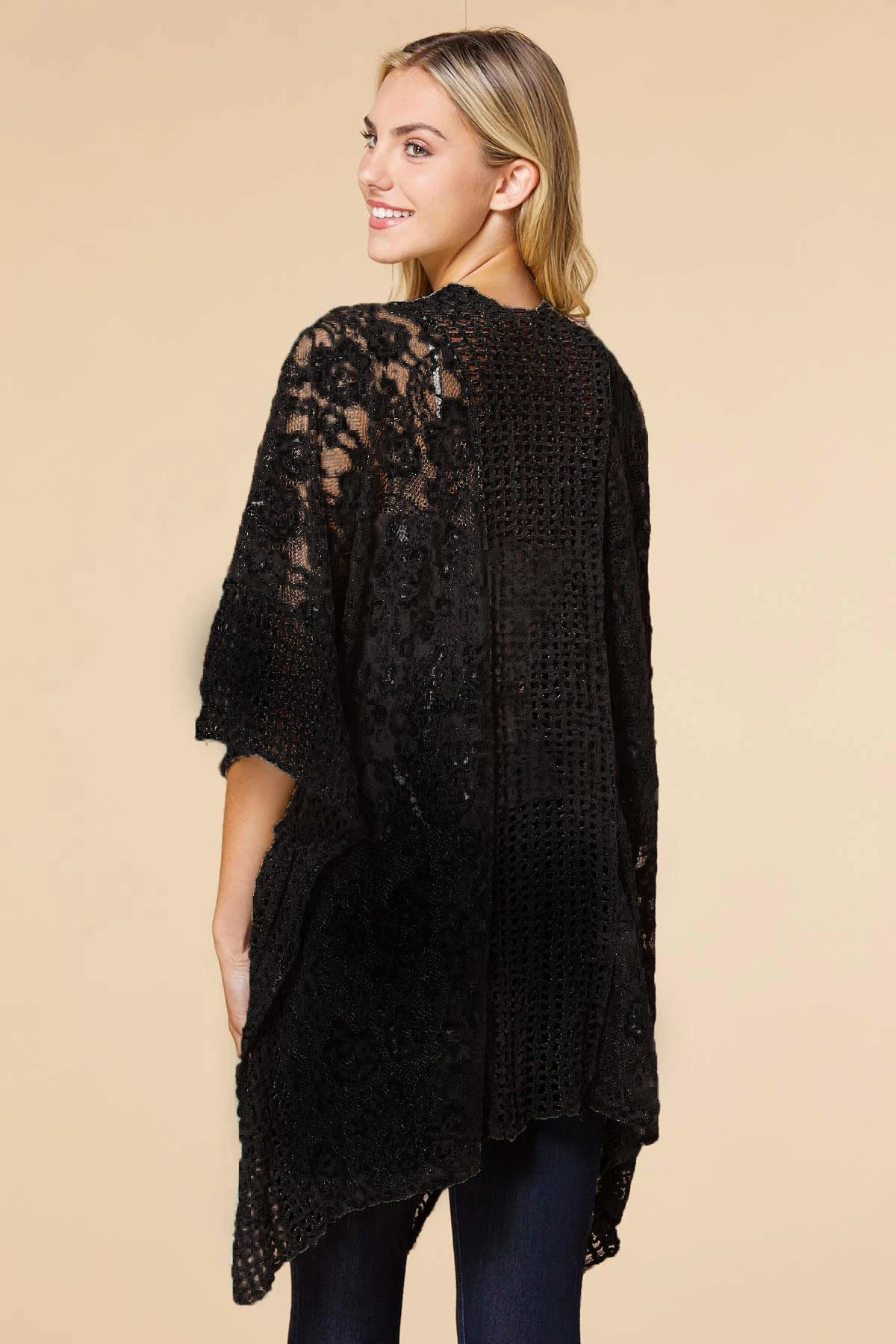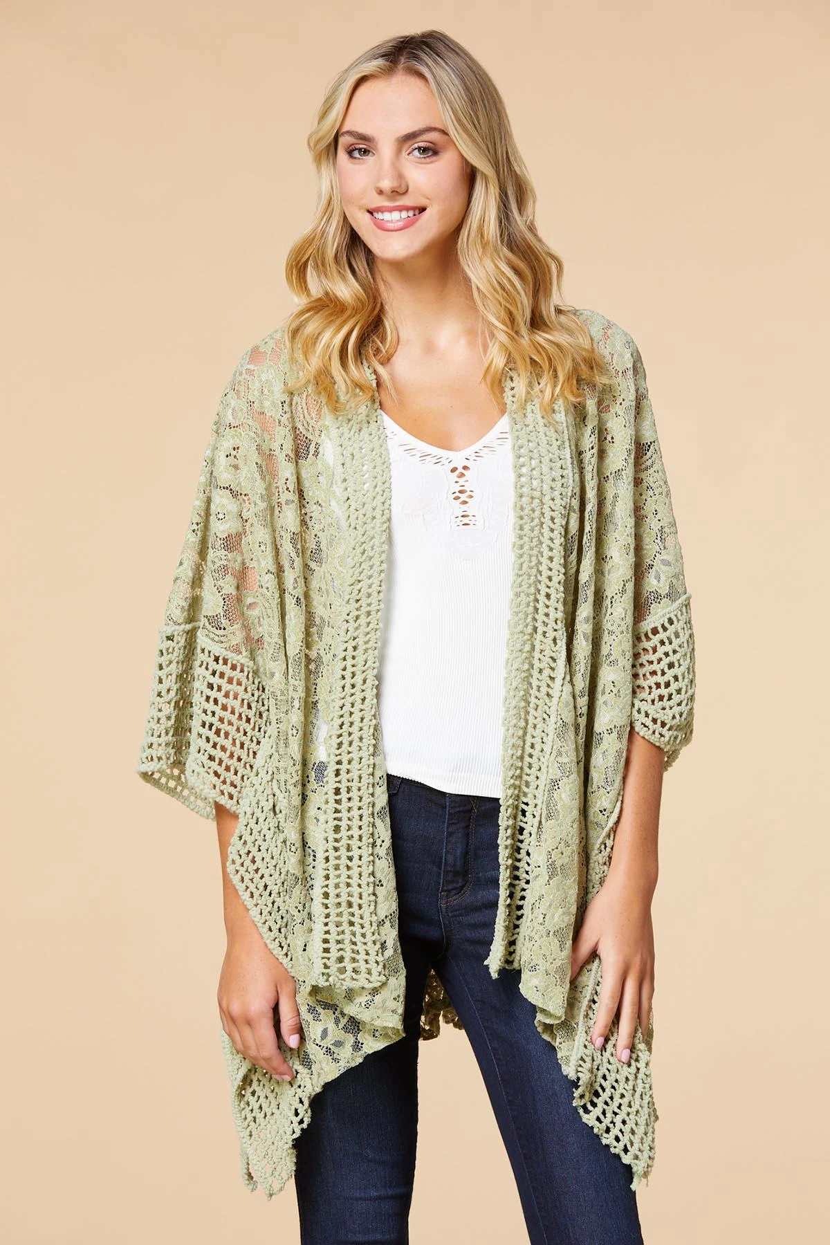 Lovely in lace. This kimono is soft and stylish with crocheted chenille details and floral lace.
