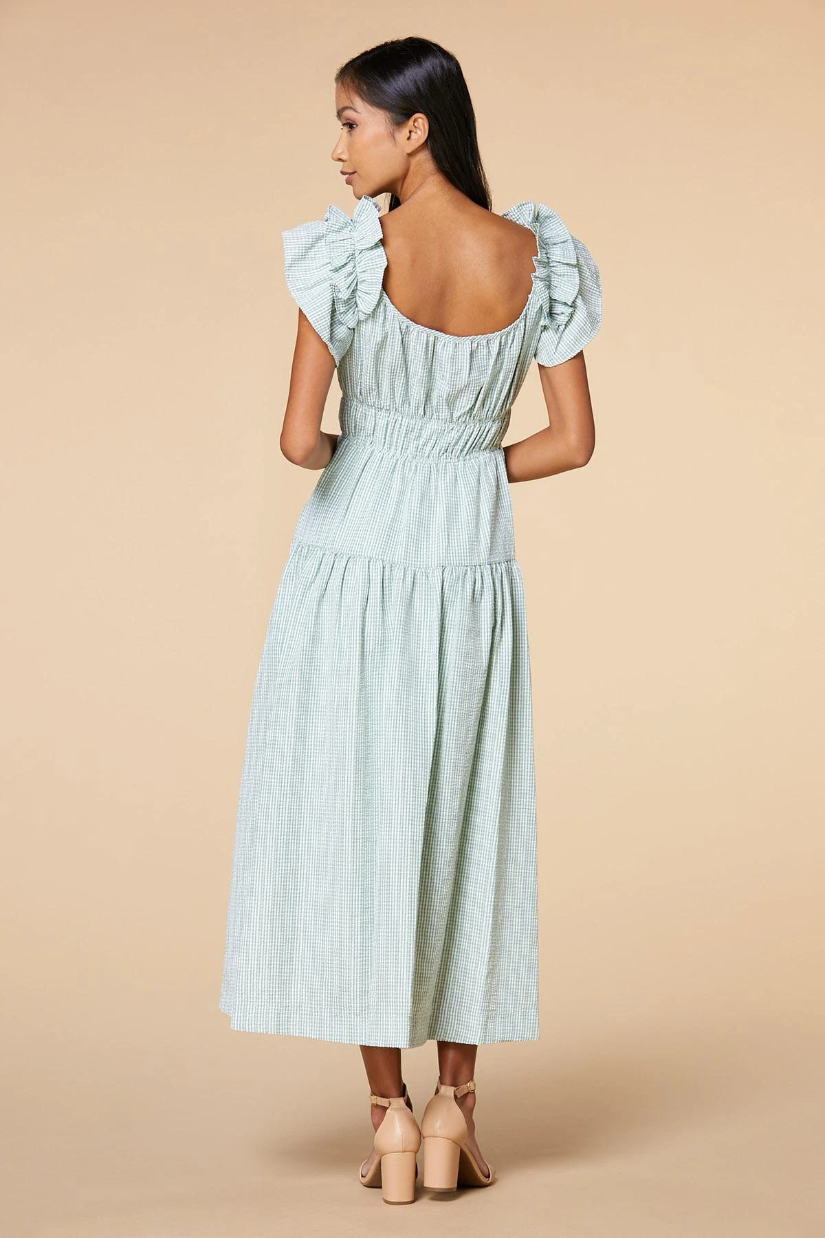 Absolutely gorgeous in a green and white gingham print, this one is sure to be a favorite with dramatic ruffled sleeves, a stretchy ruched waist and hint of shimmer – delivering a little dazzle to your day or night.