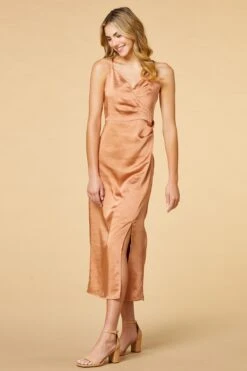 Be the star of the show with this maxi dress. Smooth satin fabrication, ruched side detail and a leg slit create a dress that’s classy, timeless and oh-so glamorous.