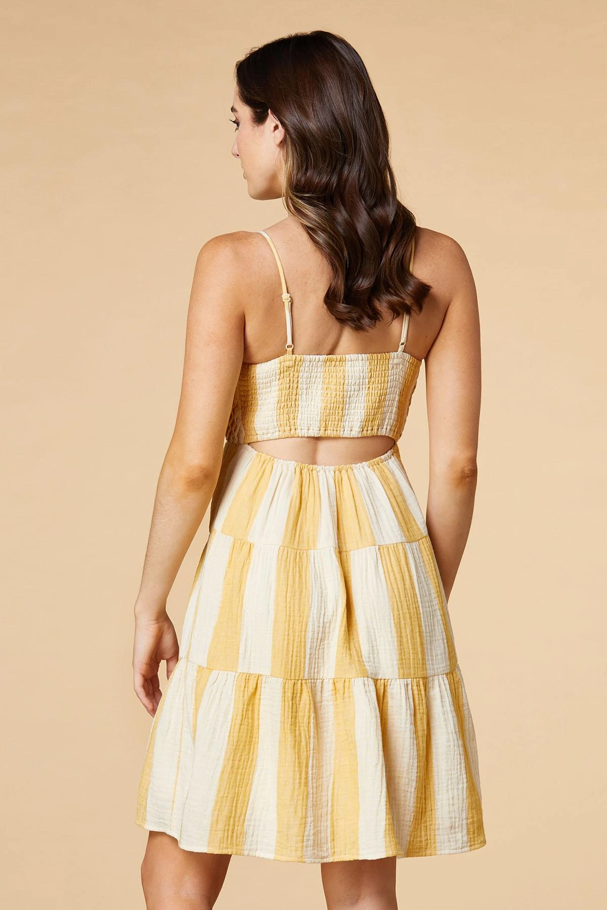 Shine as bright as the sun in this dress. A tiered body with mixed stripe prints and a fit-and-flare style create a flattering and fun outfit you can wear even on a rainy day.