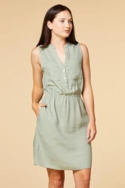 This dress is a casual Friday classic. A shirt dress style, light linen fabrication and a v-neckline are a simply stylish option that looks lovely on everyone.