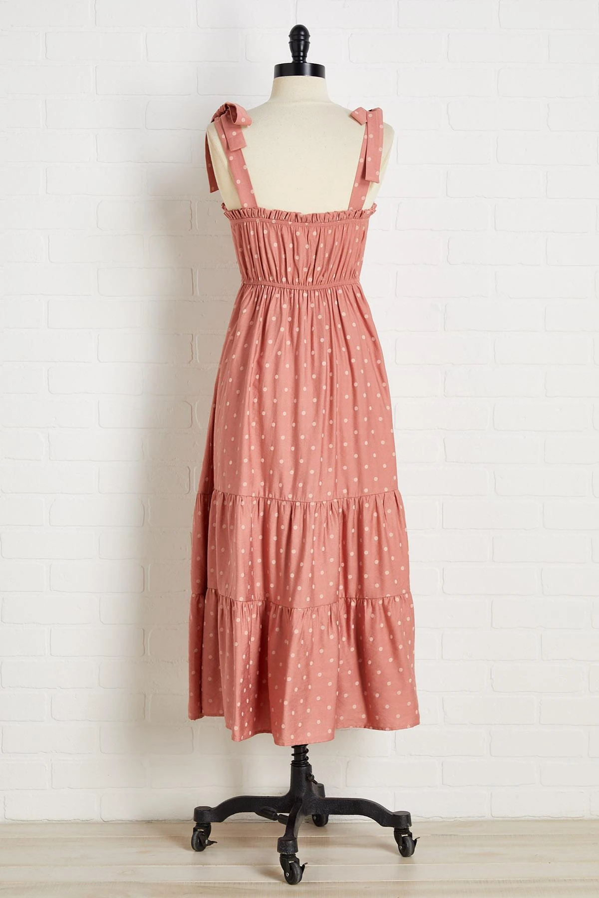 This one is pretty, and we just know you’re going to love it. Tie straps meet a ruffled bodice with an elastic waist and tiered silhouette. A contrasting, polka dot print and blush hue top it off just right.