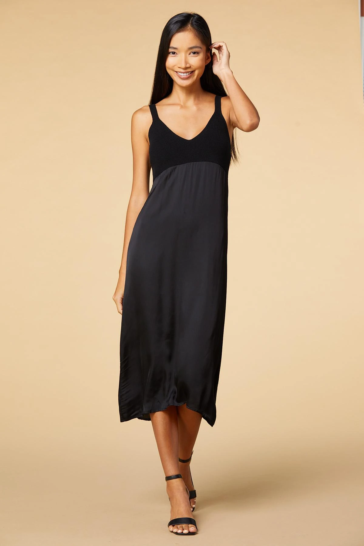 You get the best of both worlds in this midi dress. A sweater top with a v neckline meets a satin skirt that’s silky-smooth and flows with you while you walk.