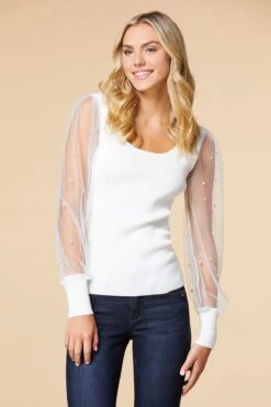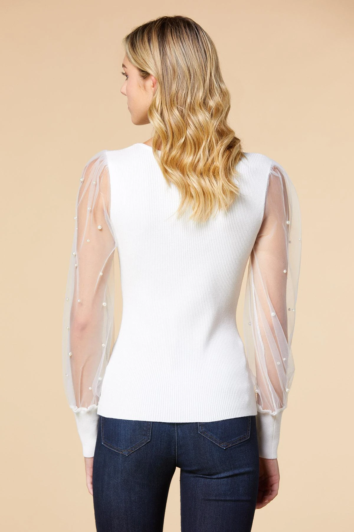 It’s shocking how cute this sweater is. A ribbed body with a scoop neckline meets mesh sleeves embellished with pearls.