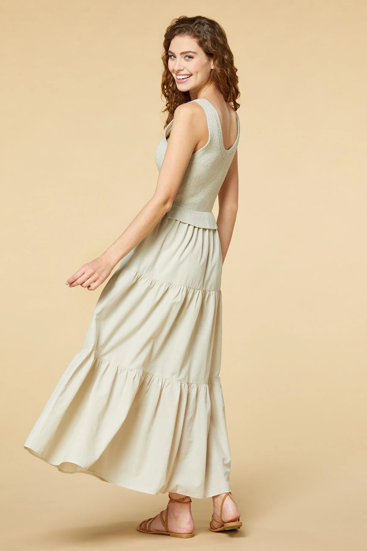 You’ll be catching feelings with this two-in-one look with a sweater-knit bodice and tiered bottom half. It’s an adorable sweater over skirt vibe coming to you in one darling dress.