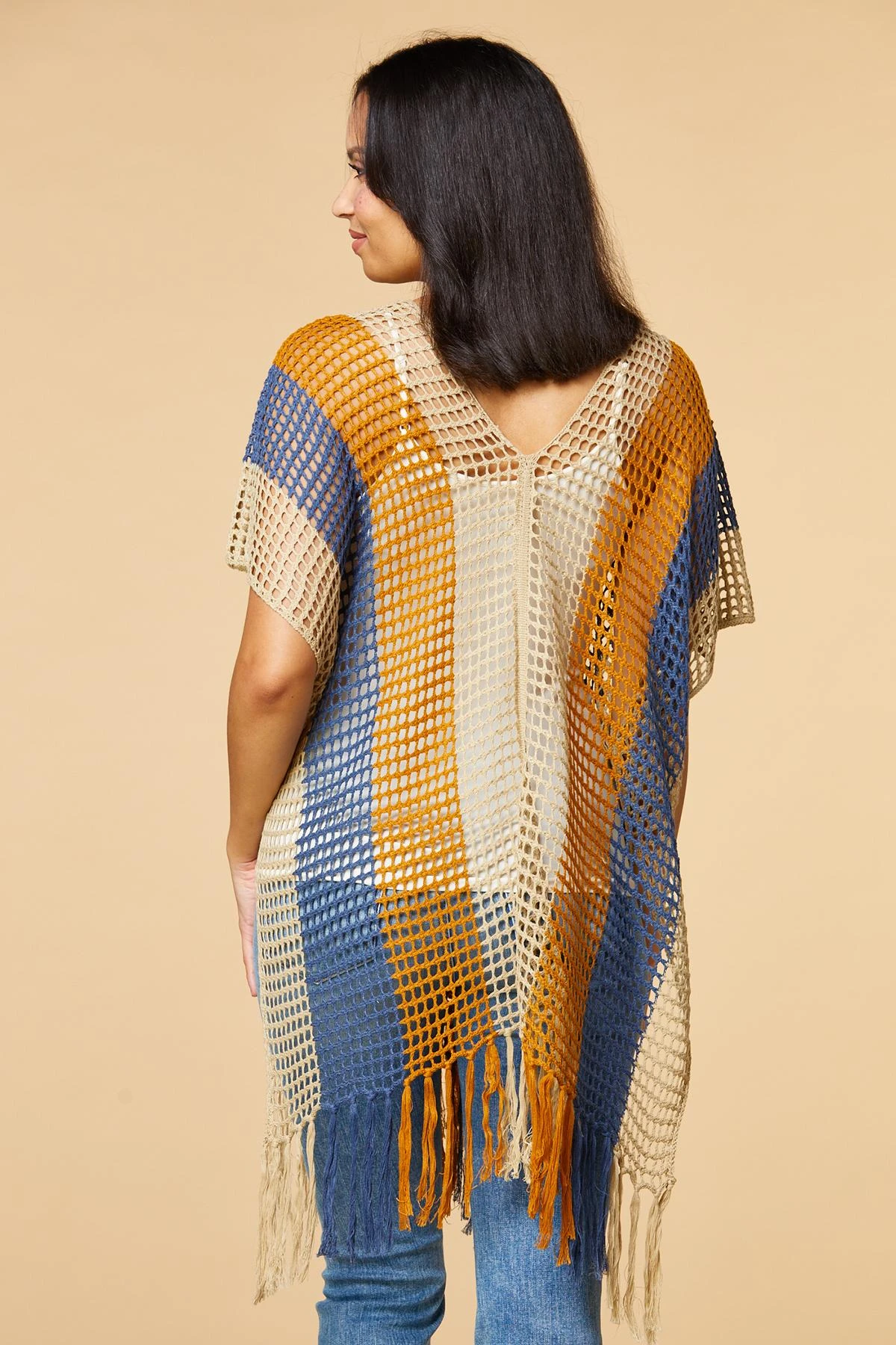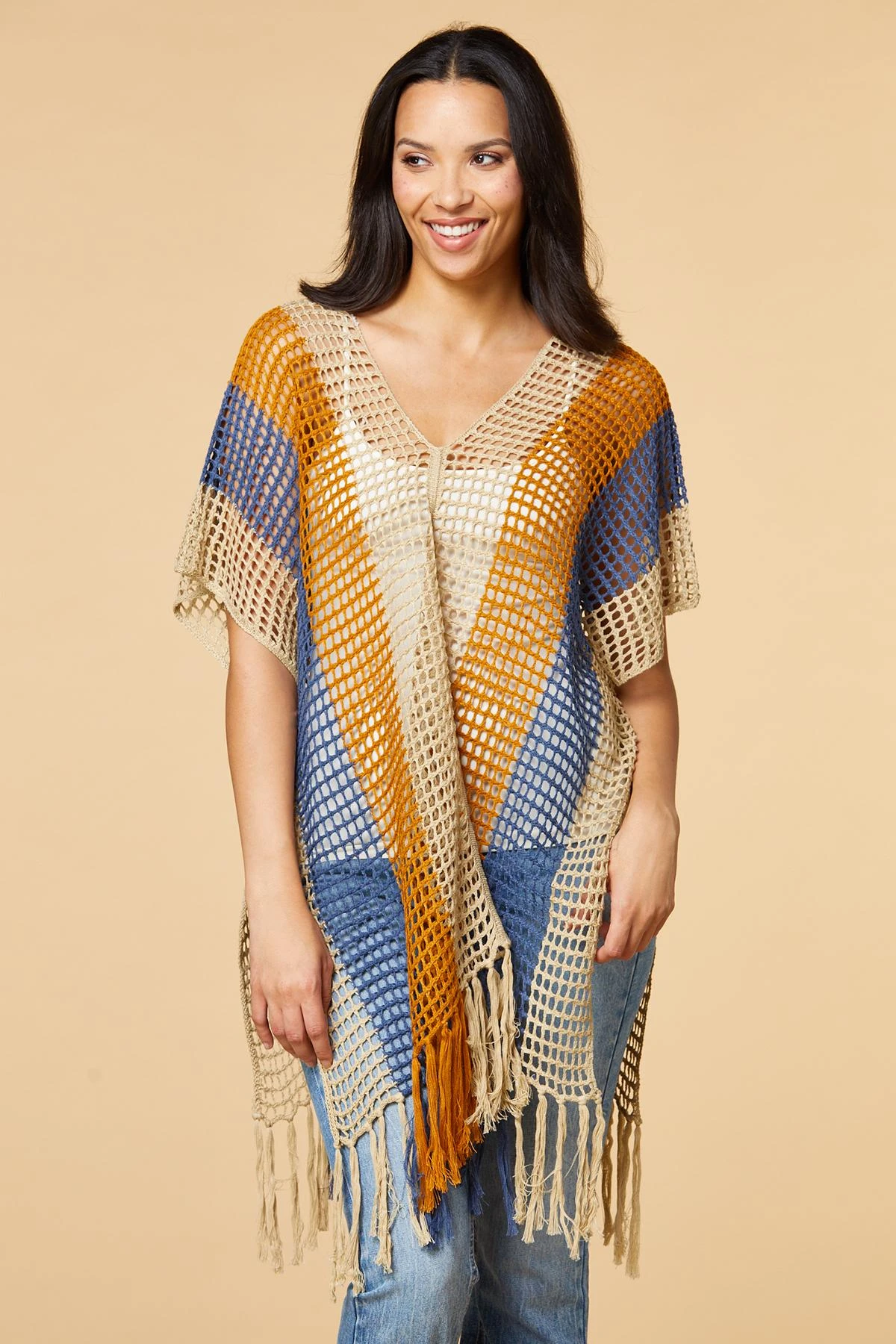 Missing the final piece of your perfect outfit? Try this crochet poncho. A multicolor stripe print, v-neckline and a fringed hem create the ultimate accessory you won’t want to leave at home.