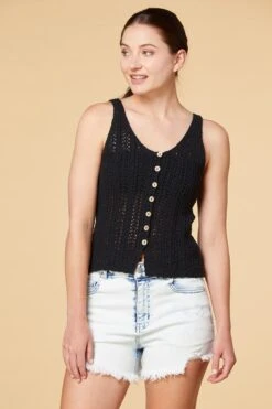 Who said sweaters were just for winter? Style in the sun with this open-stitch sweater tank that features a button-down front.