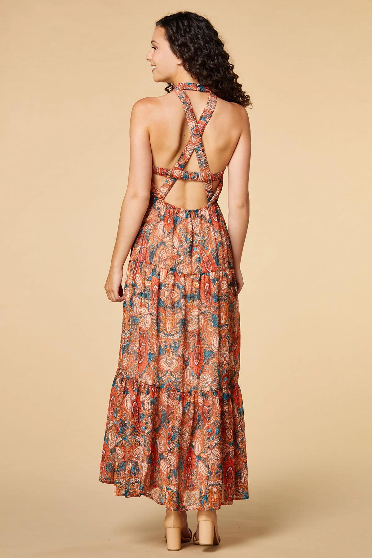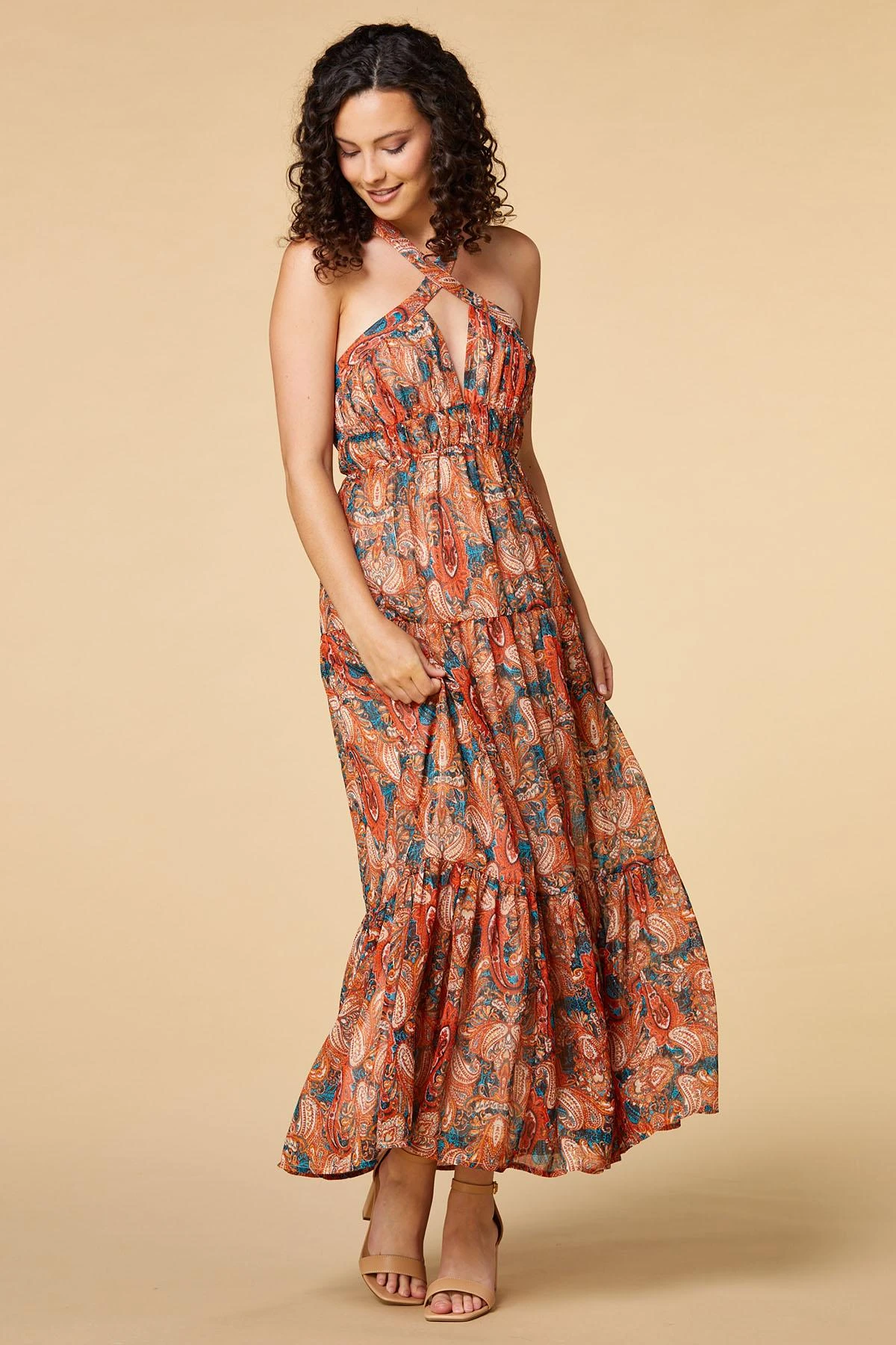 This paisley printed number is as fun as it is fashionable. A halter neckline, tiered body and hints of gold create a flattering fit for anyone.