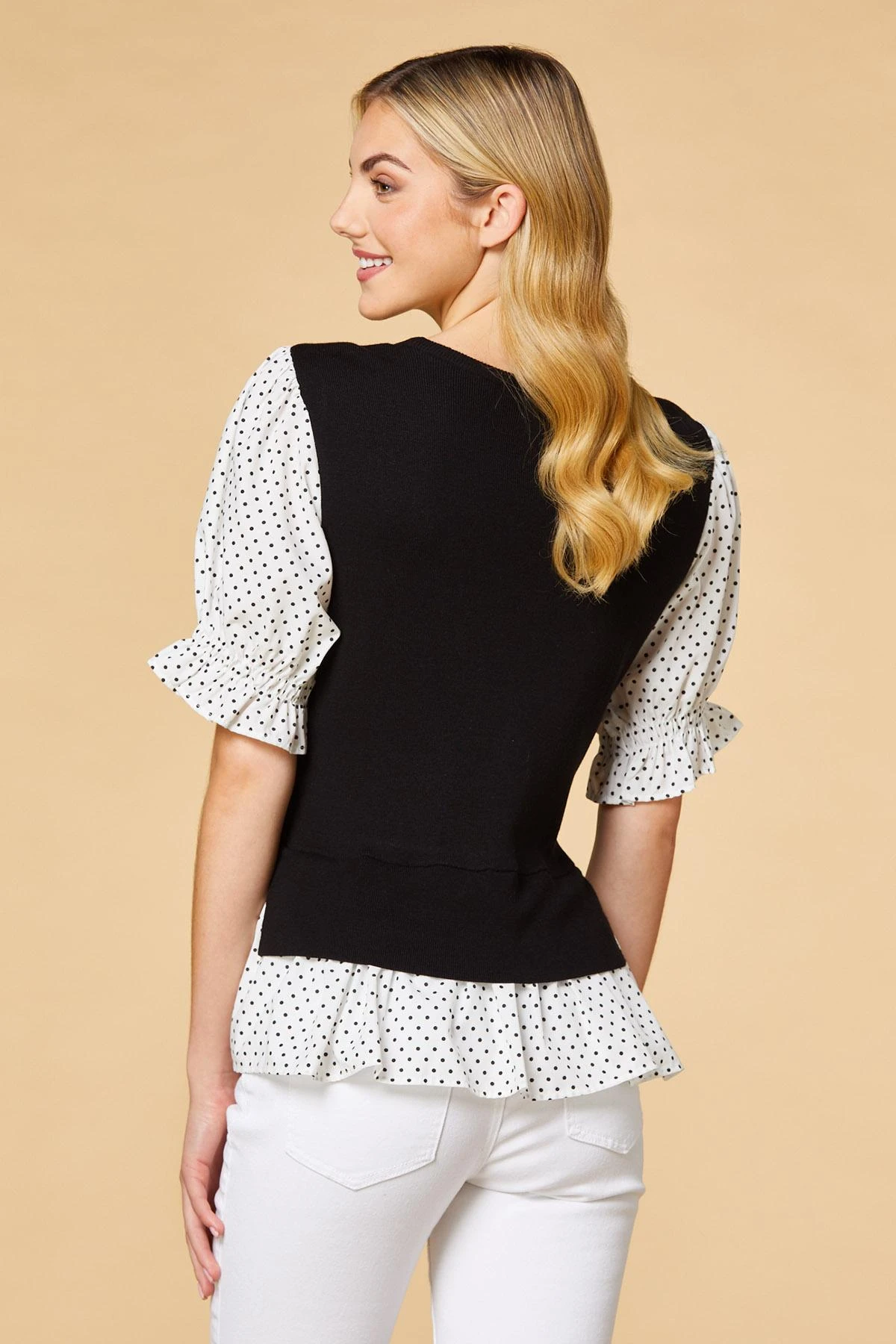Café au lait, anyone? This très chic top includes puffy sleeves and a flounced hem with a dot print and a solid colored sweater body, because Paris is always a good idea.