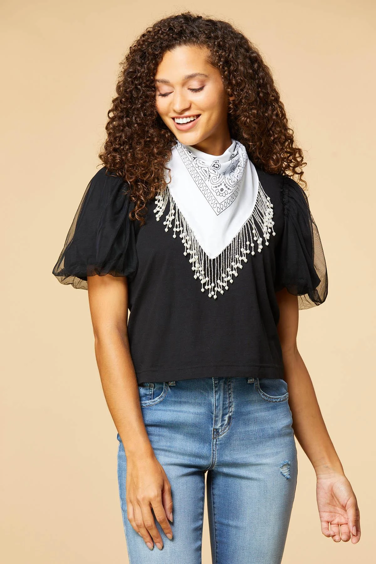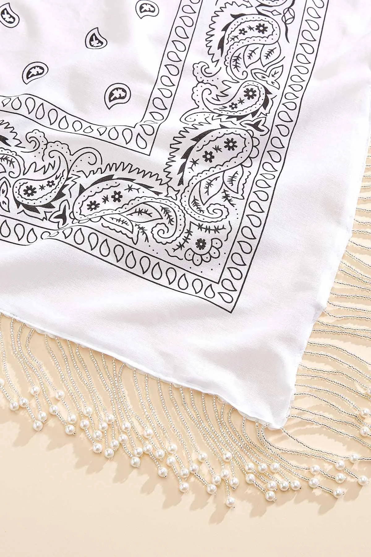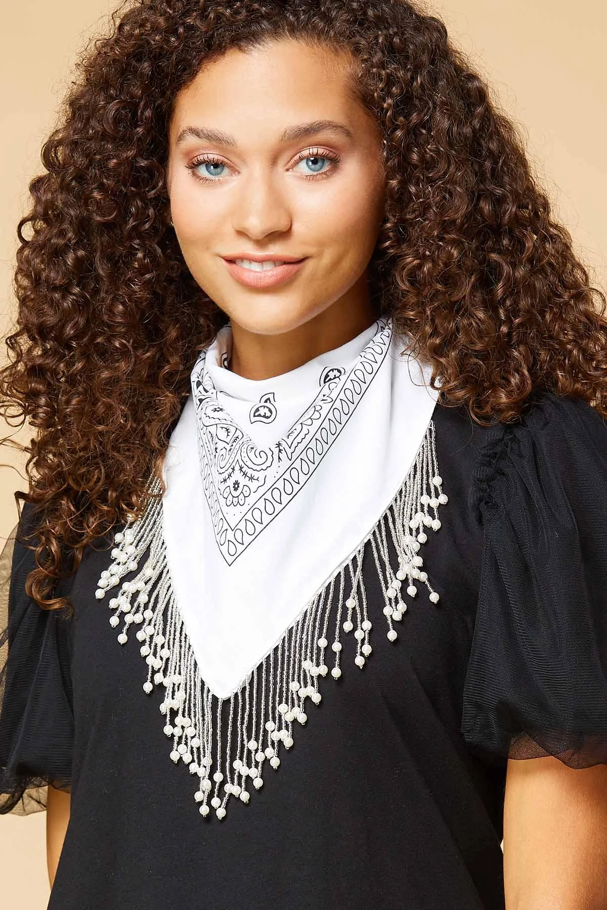 Bachelorette, weekend getaway or just because…this bandana’s here for it all. Your basic bandana style in black and white gets an extra oomph from beaded pearl fringe.