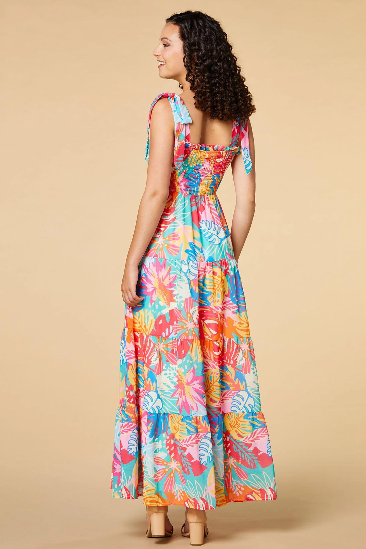Whether you’re on vacay or going out on the town, this dress is sure to turn heads every time. A bright and beautiful tropical print covers every tier of this flowing maxi with a smocked top and tie straps.