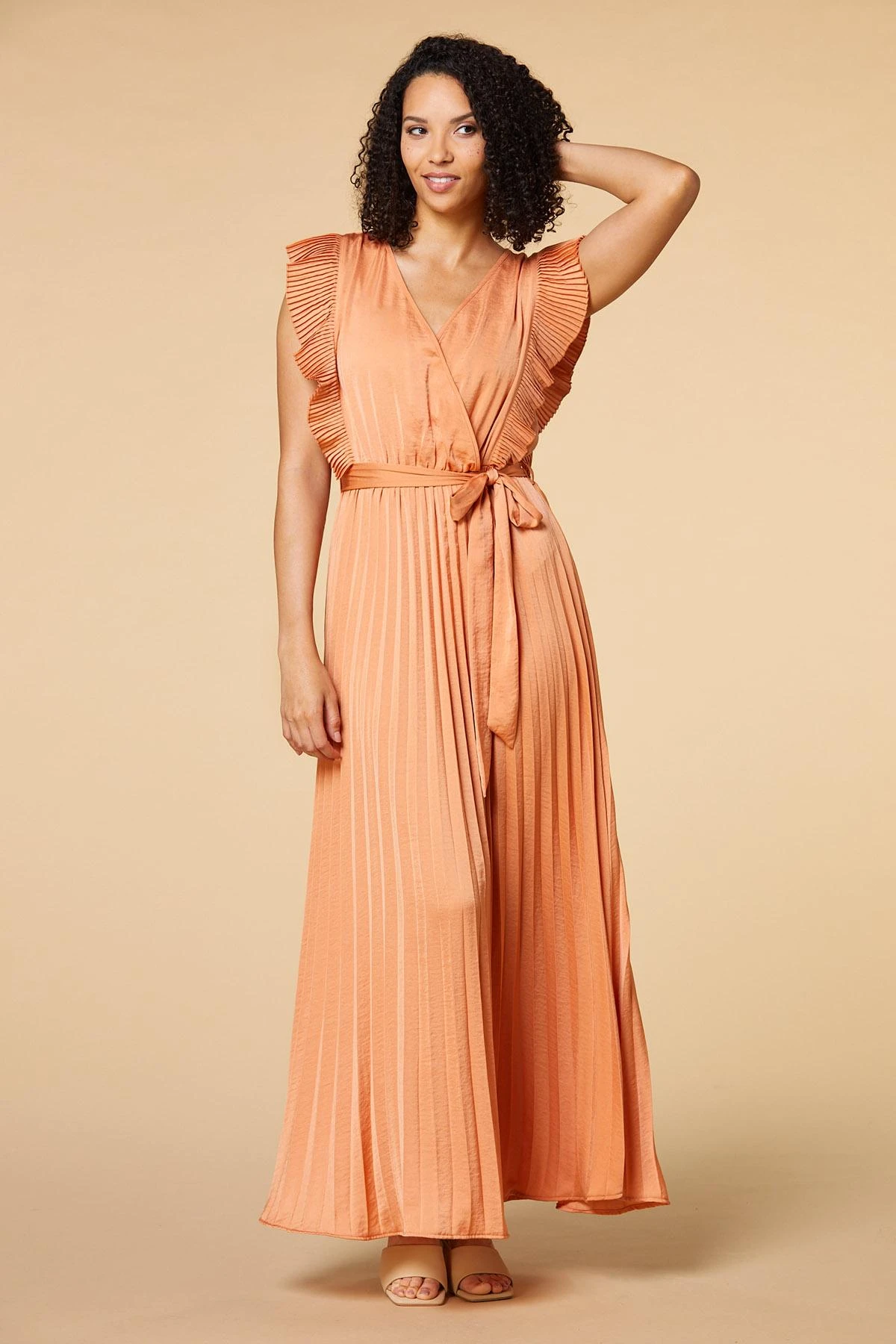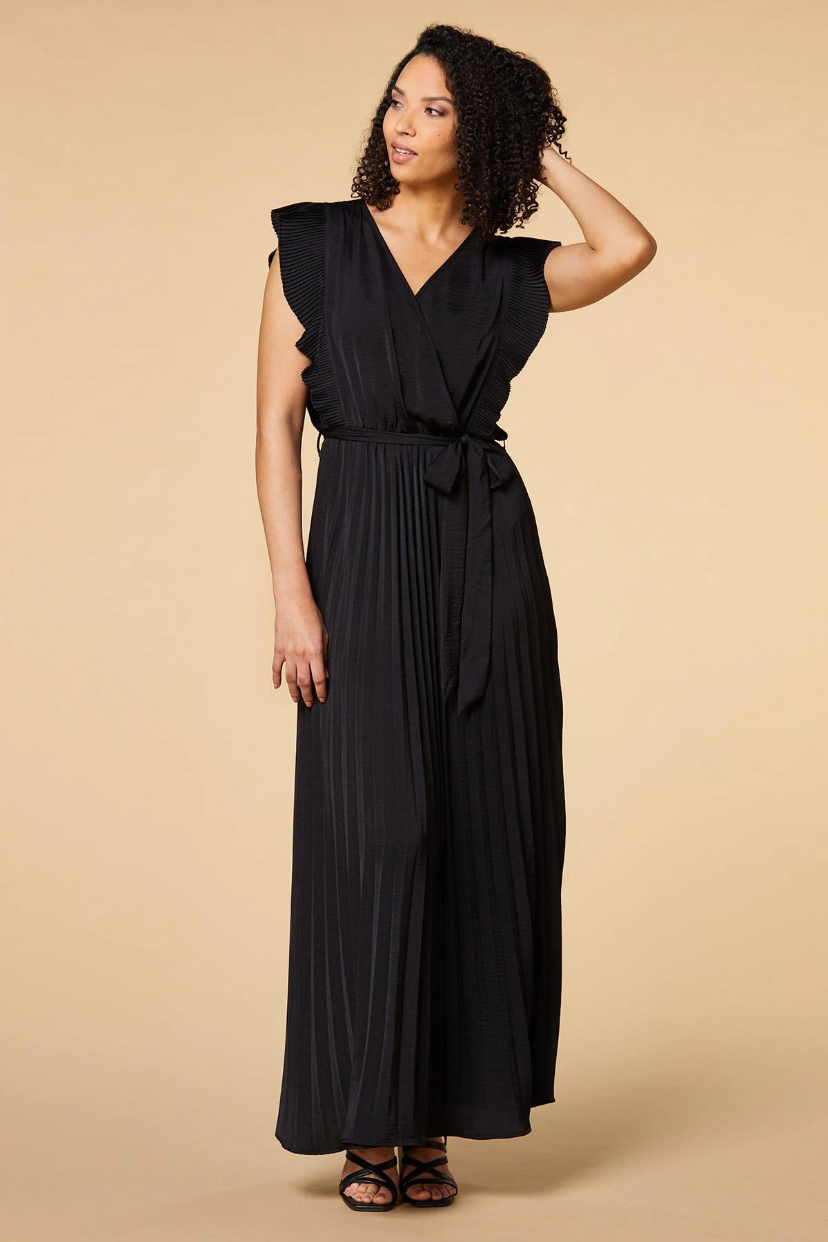 Pleat perfection! This maxi dress features a front tie belt, v-neckline and pleats for days.