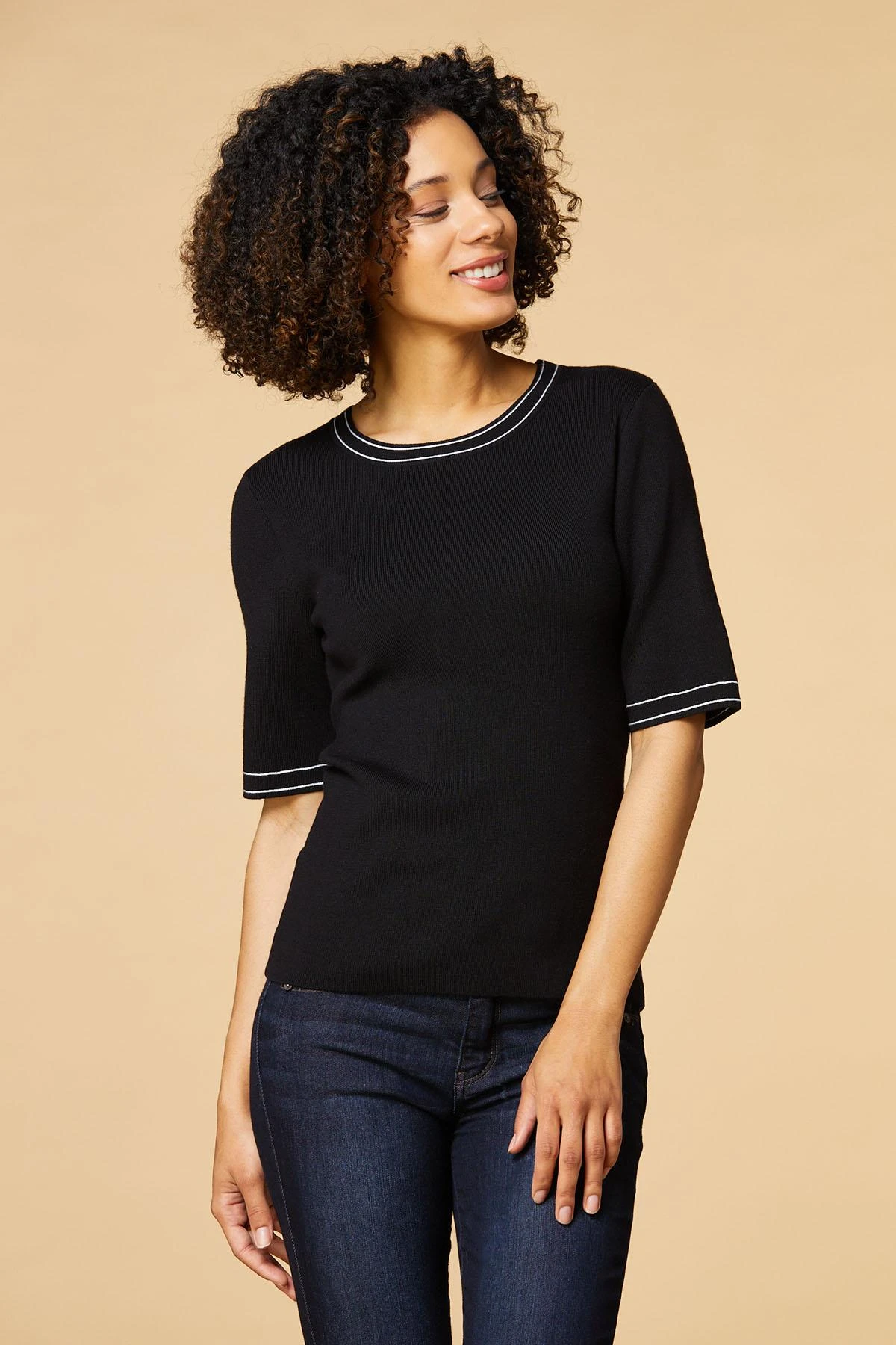 A simply classic contrast. This short sleeve sweater includes soft and cozy fabrication, a crew neckline and contrasting white trim.