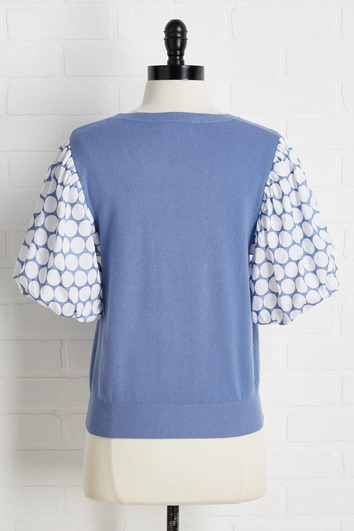 You’re invited to the fun vibes this popover style brings with a pretty blue hue, puff sleeves and a polka dotted print with a hint of shimmer.