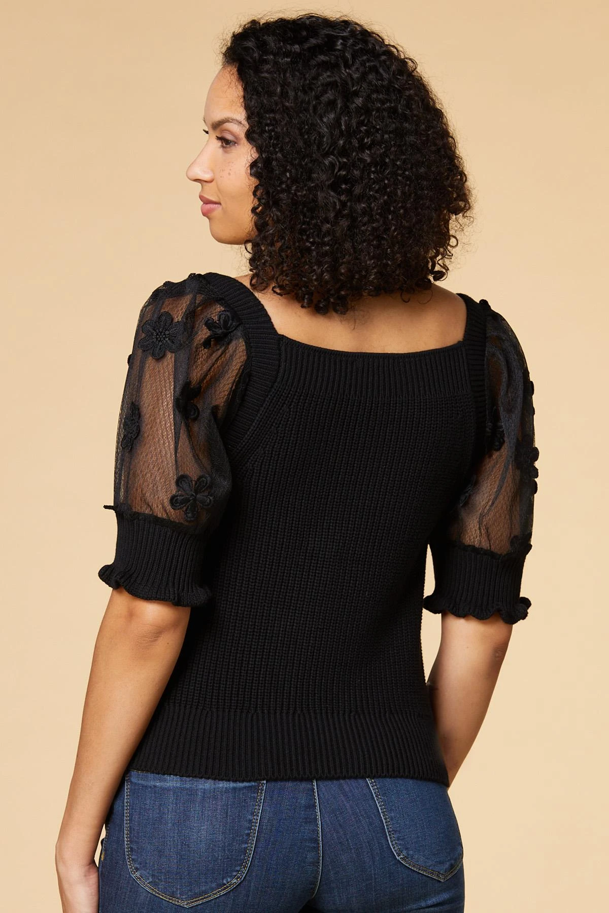 This cute sweater has subtle but lovely floral details on puffy mesh sleeves and a trendy square neckline.