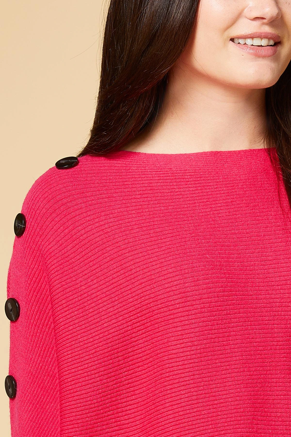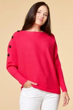 It’s impossible to stay mad when you throw this number on. Soft fabrication with a ribbed texture, a boat neckline and button details are featured in this bold sweater.