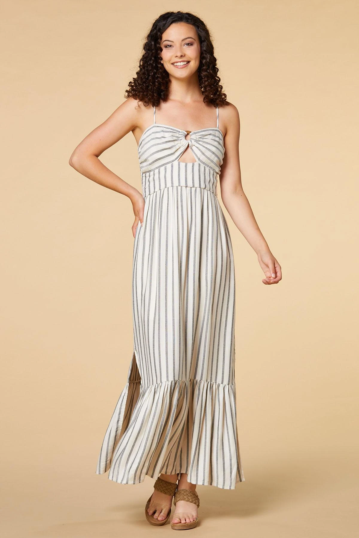 This maxi dress is the ultimate option for the busiest globetrotter. Soft, light fabric and double slits helps keep things breezy while a flounce hem and a cutout ring add trendy details.