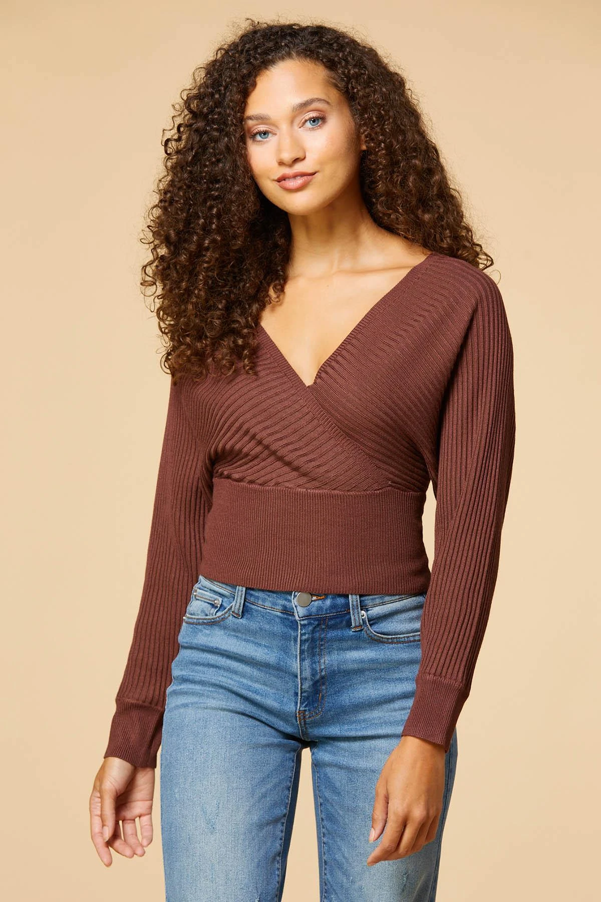 It’s finally sweater season. Celebrate with this top! A crossover style with ribbed fabrication and a cropped hem is a perfect first step into the best time of the year.