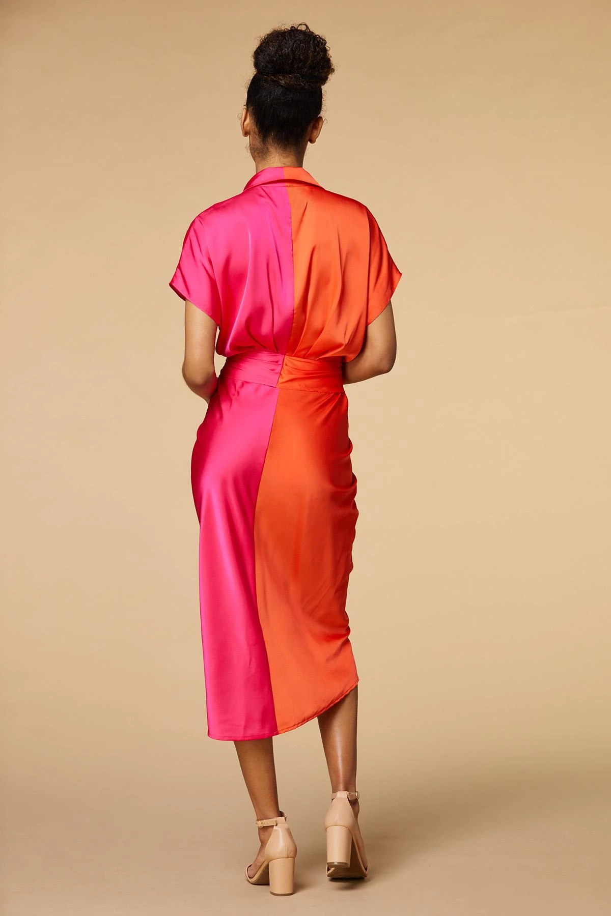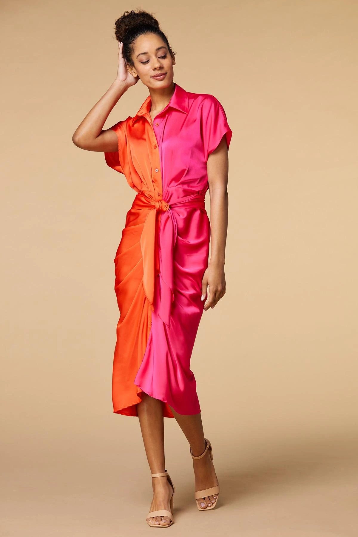 It’s all eyes on two hues and you with this stunning-satin style. A collared neckline meets a button-down closure, ruched detail, and flattering, belted-tie waist, while an orange and pink color palette makes the look pop so perfectly.