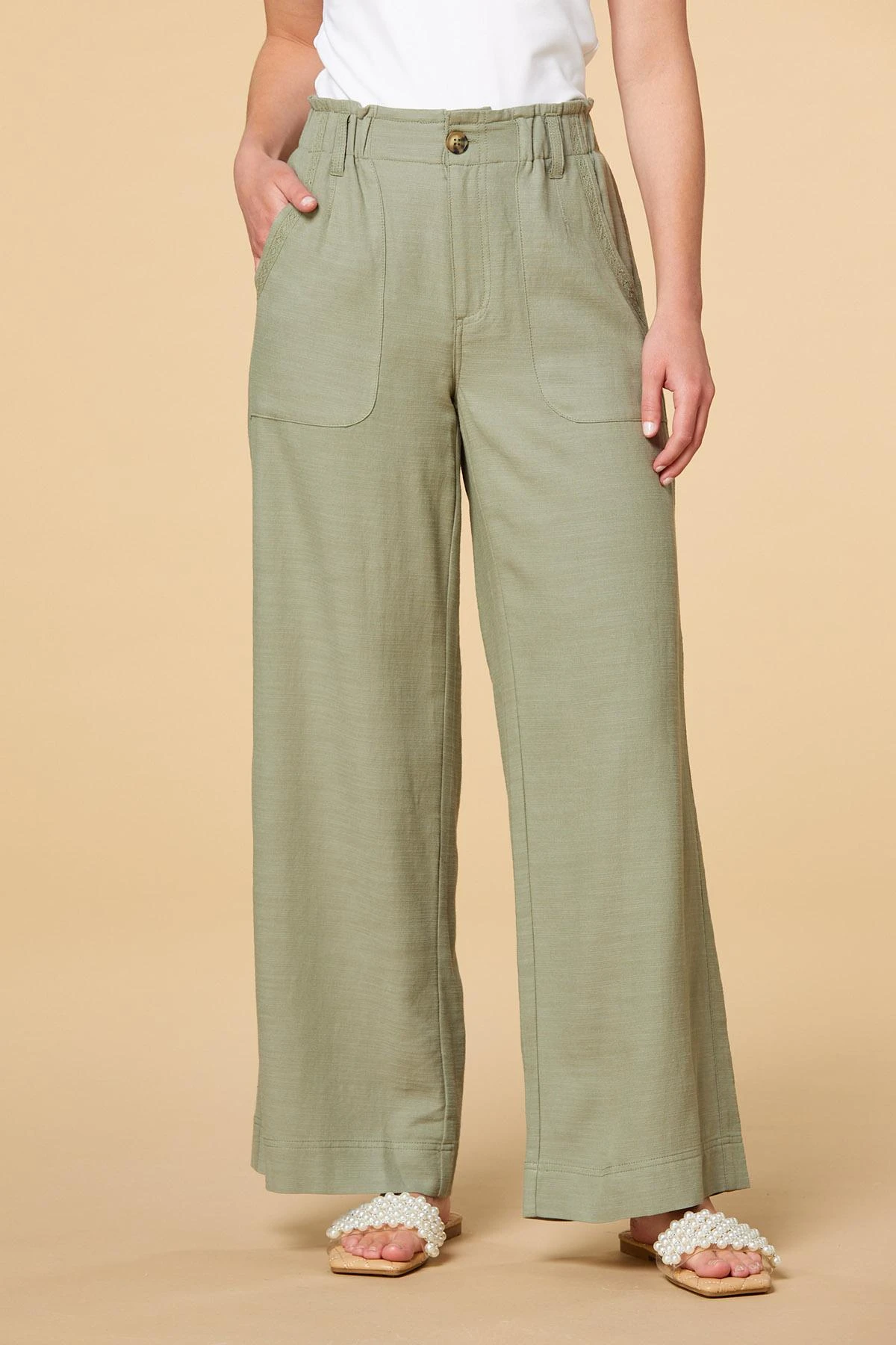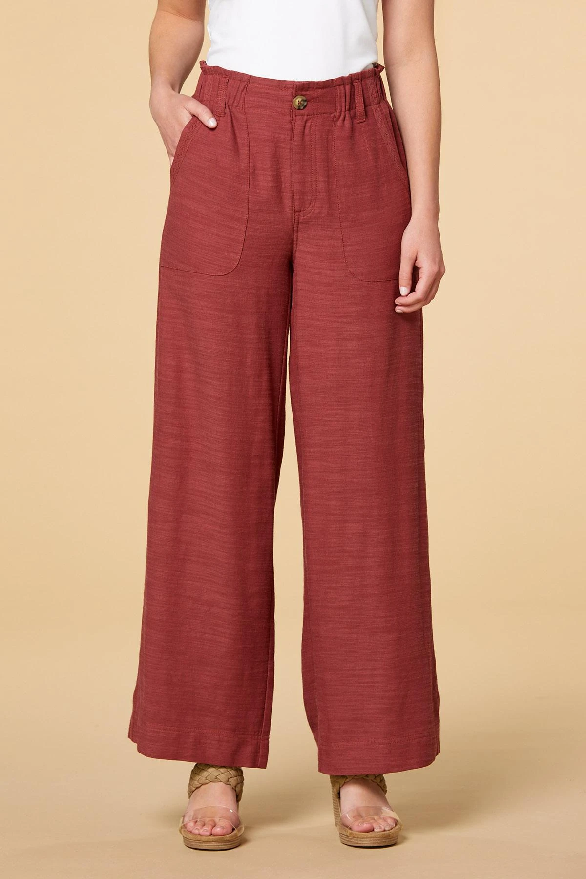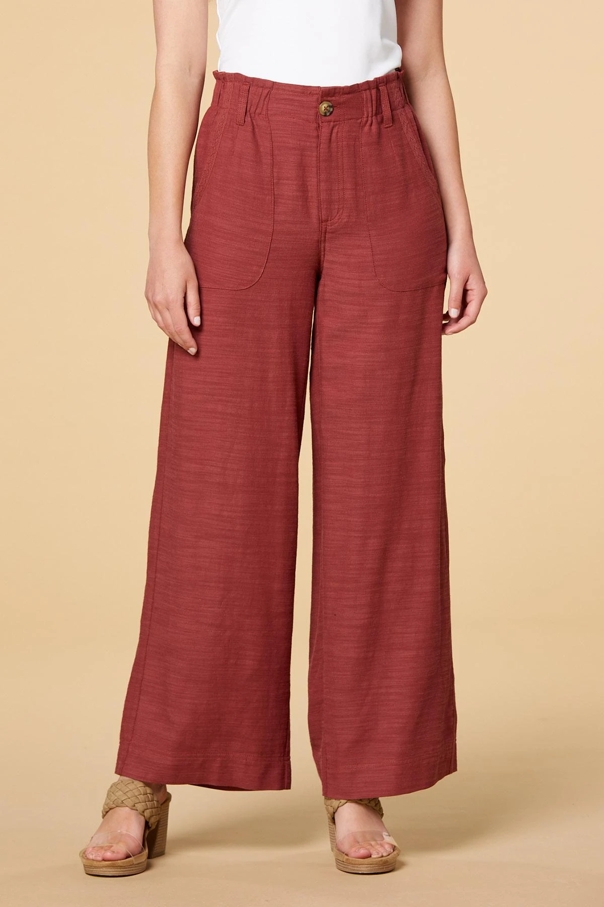 Need a boost? Find it in these high-rise pants. Soft, light fabrication, a paper bag waist and wide-leg style create an easygoing style that never looks lazy.