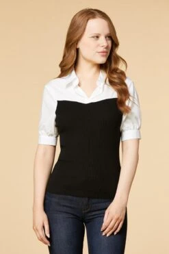 In need of a little French getaway? We’ll take you there with this chic top. A sweater body contrasts with poplin sleeves and a partial button-down front.